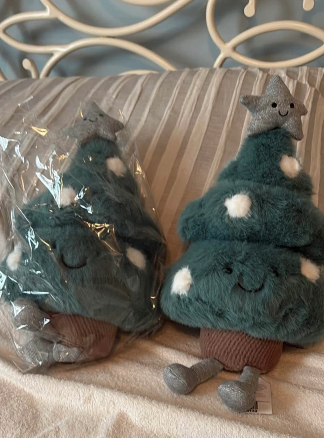 Super soft Jellycat plush Christmas tree with a friendly face and star topper. One is in original packaging, the other is open but in great condition. It's made with a fuzzy teal material and has white pom-pom accents.