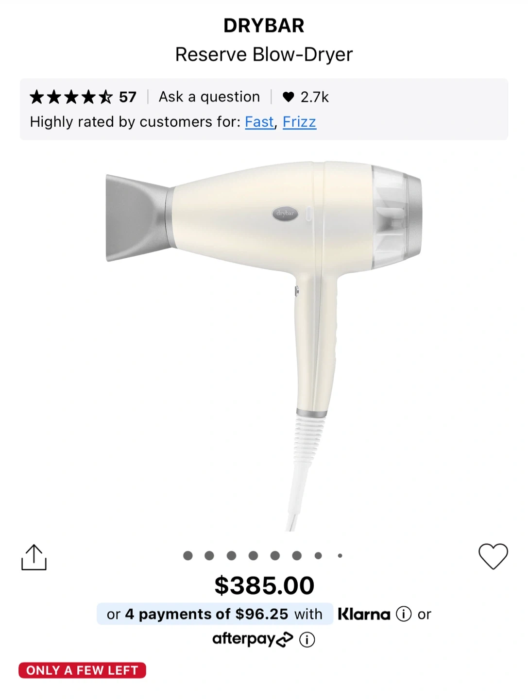 This is the Drybar Reserve Ultralight Anti-Frizz Blow-Dryer. It's designed to reduce frizz and dry hair quickly. Its ultralight design makes it easy to handle.