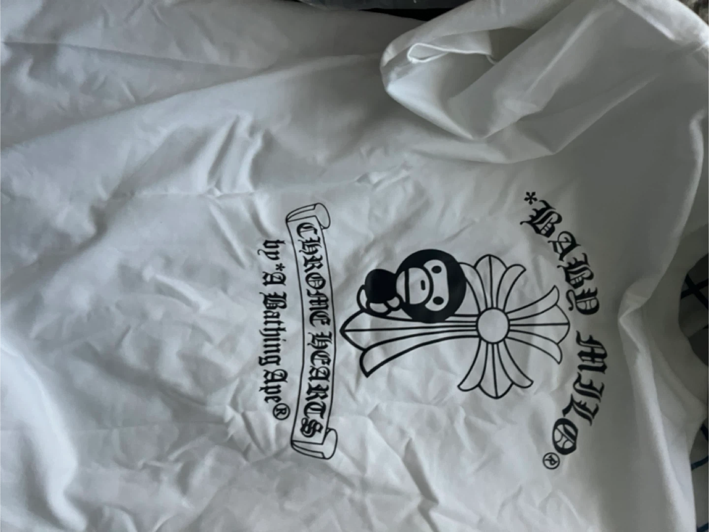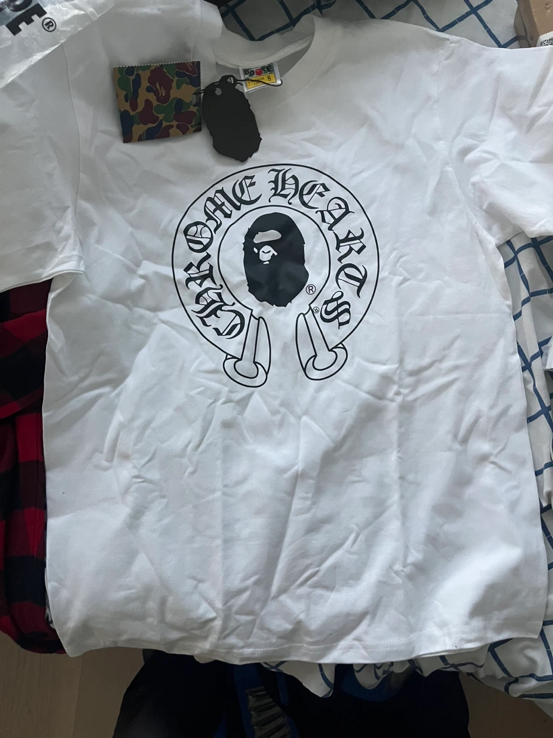 Selling a brand new Chrome Hearts x BAPE t-shirt in white! This is a collaboration piece, featuring designs from both brands. The size is small, and it's in excellent condition with tags still attached!