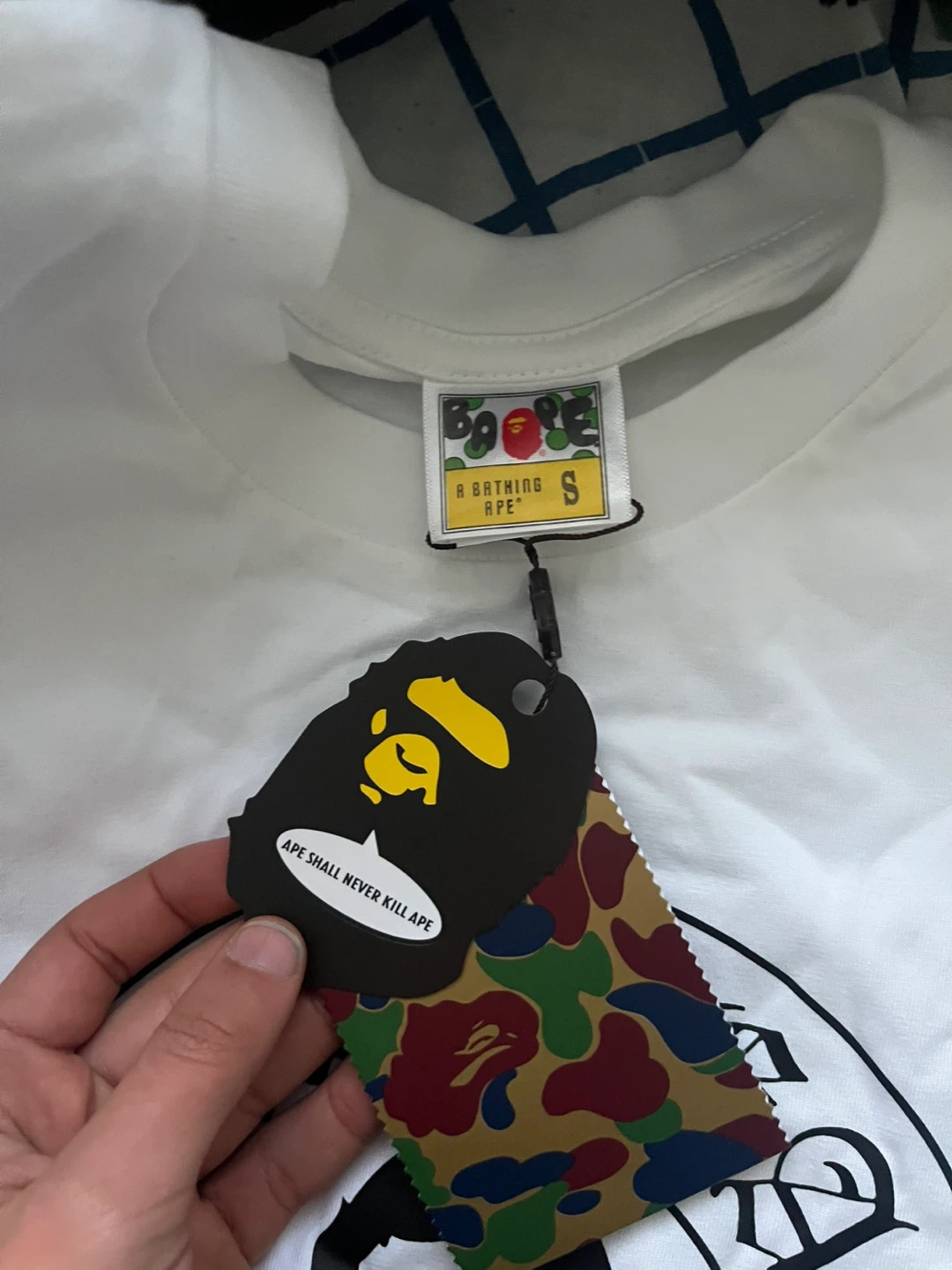 Selling a brand new Chrome Hearts x BAPE t-shirt in white! This is a collaboration piece, featuring designs from both brands. The size is small, and it's in excellent condition with tags still attached!