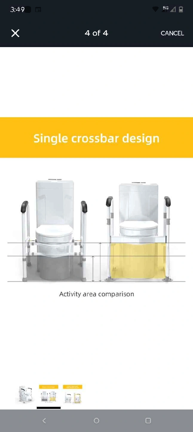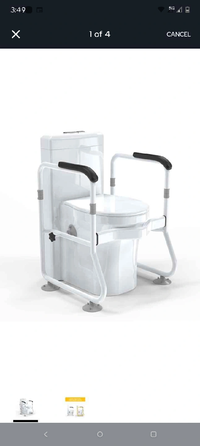 Toilet safety frame with a closed loop design. It has a weight capacity of 300lbs. The design also has a single crossbar new sealed in box