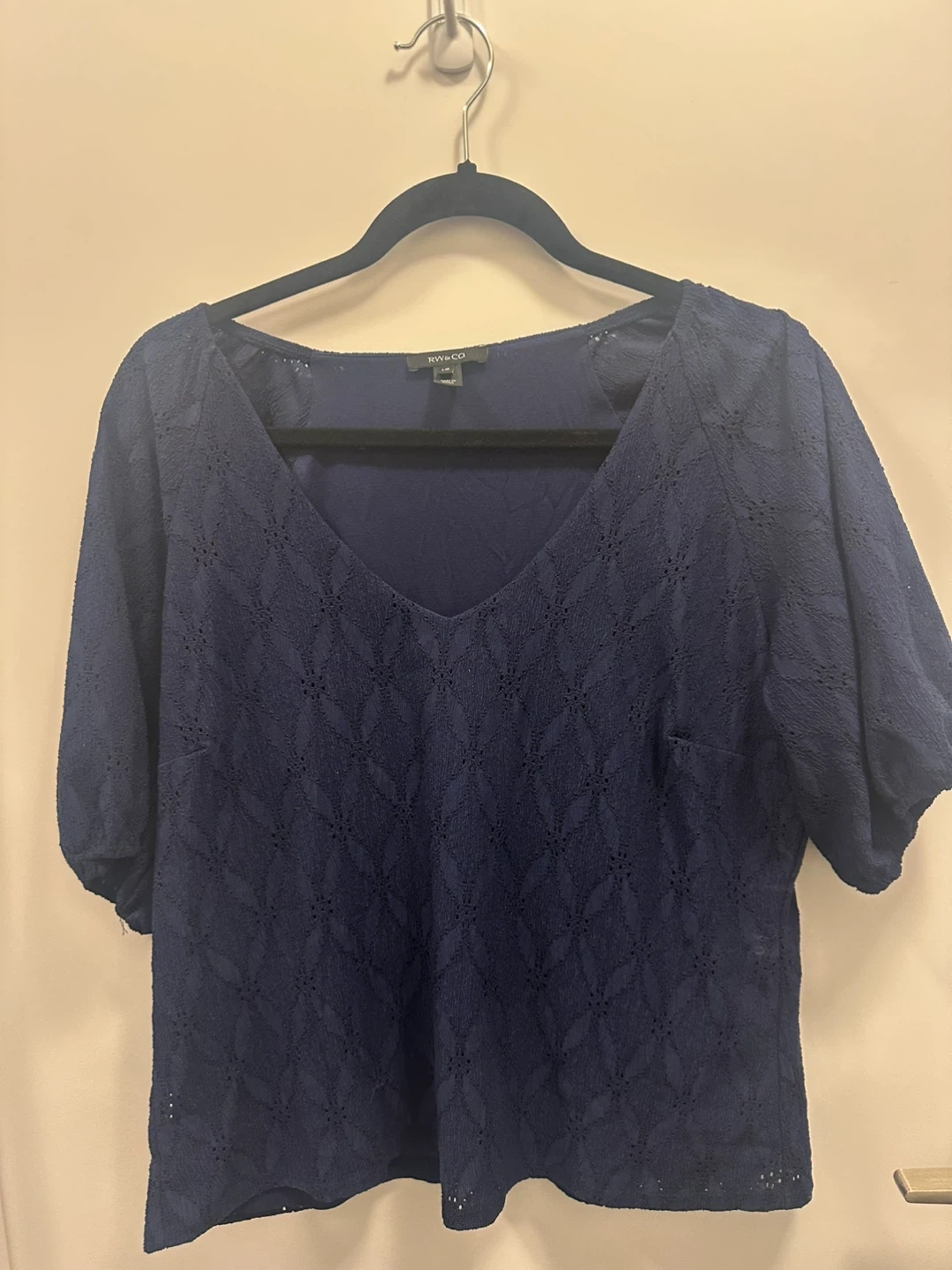 *Like New* Navy blue shirt from RW&CO. in size large. Features eyelet/lace overlay on lined blouse. Short sleeve (just above elbow ) with elasticized hems.