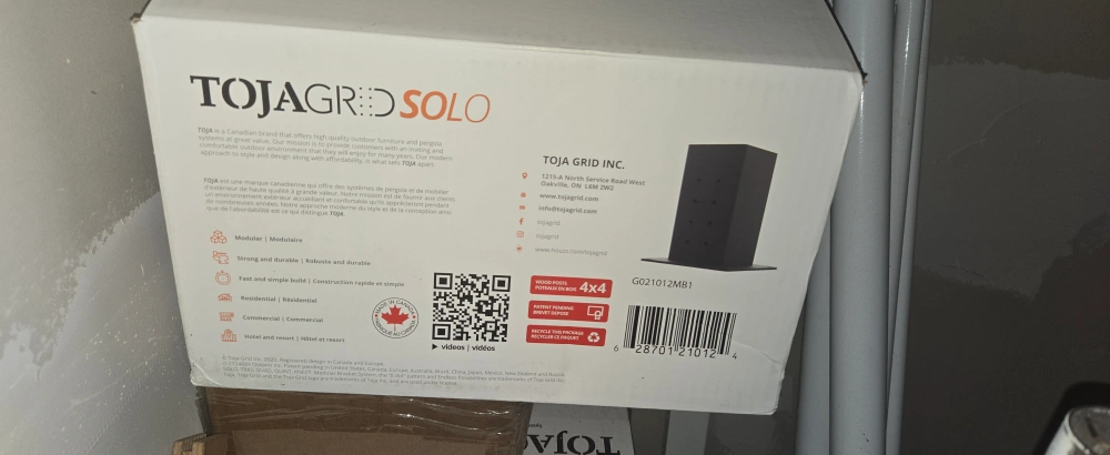 Selling a TOJAGRID SOLO wood post anchor for 4x4 posts. This is a Canadian brand that offers high quality outdoor furniture and pergola systems. The box says it's modular, strong, durable, fast and simple to build, and suitable for residential, commercial, and hotel/resort use