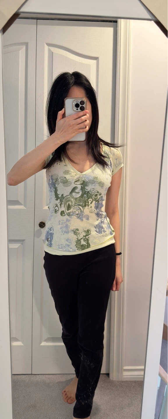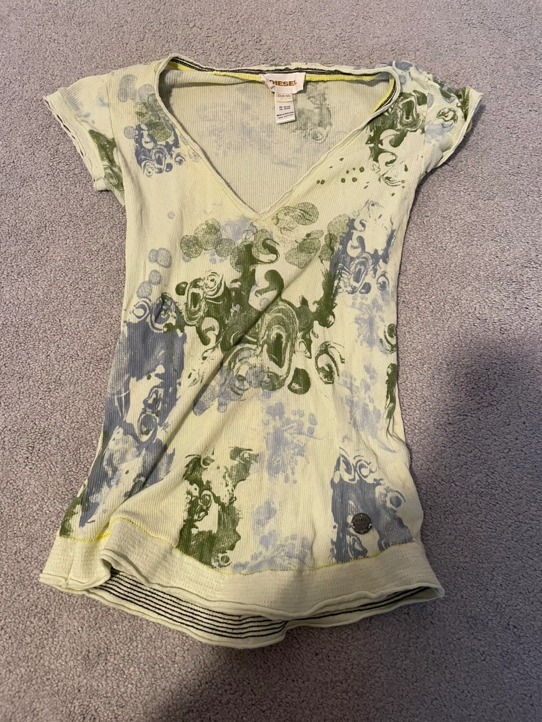 This is a Diesel women's t-shirt with a unique graphic print. It's a short-sleeved, v-neck style. Made from a ribbed knit fabric.
