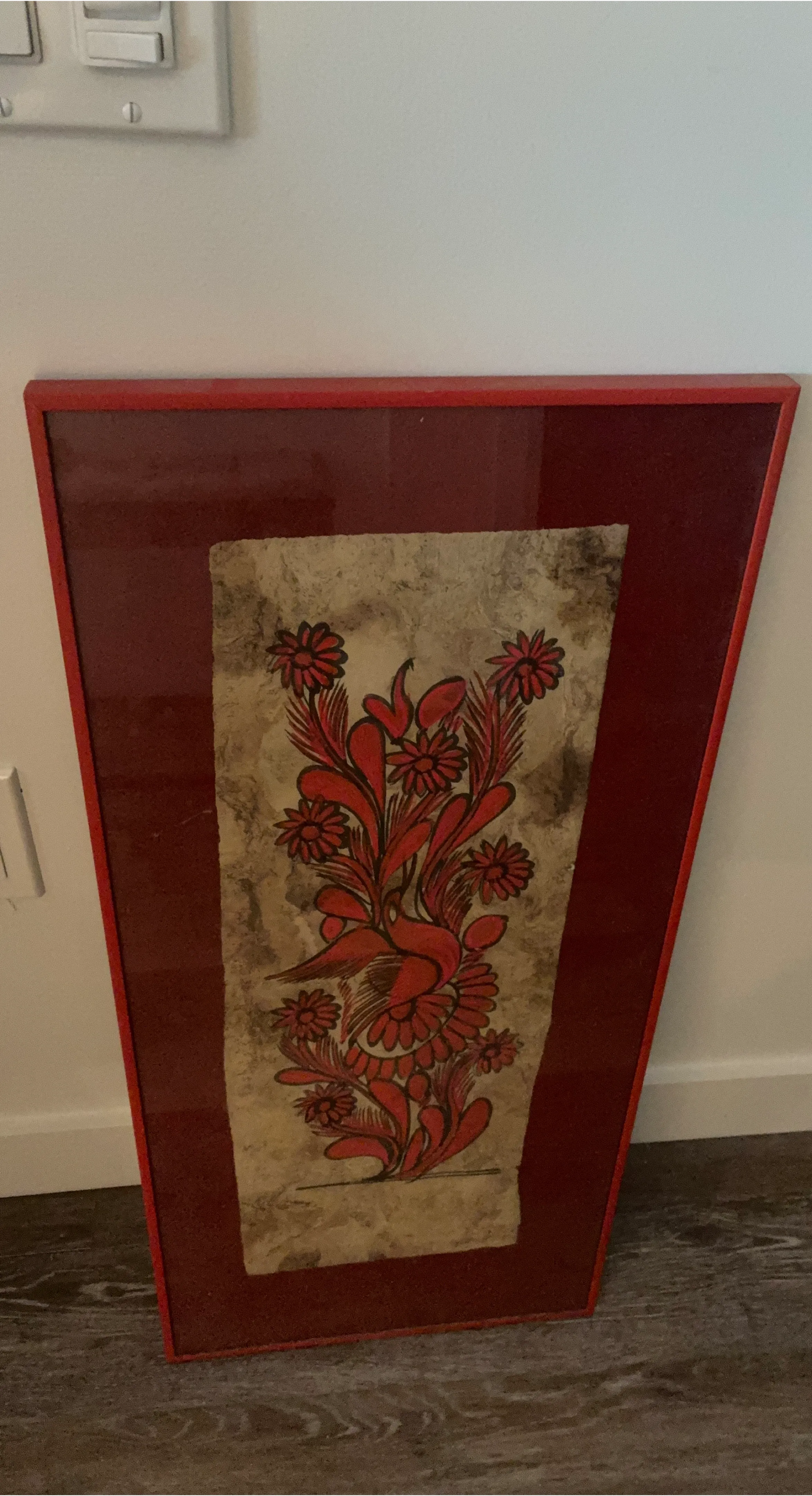 This framed artwork features a vibrant red floral design on a textured, neutral background. It's housed in a simple red frame. The art is a unique decorative piece for any room.