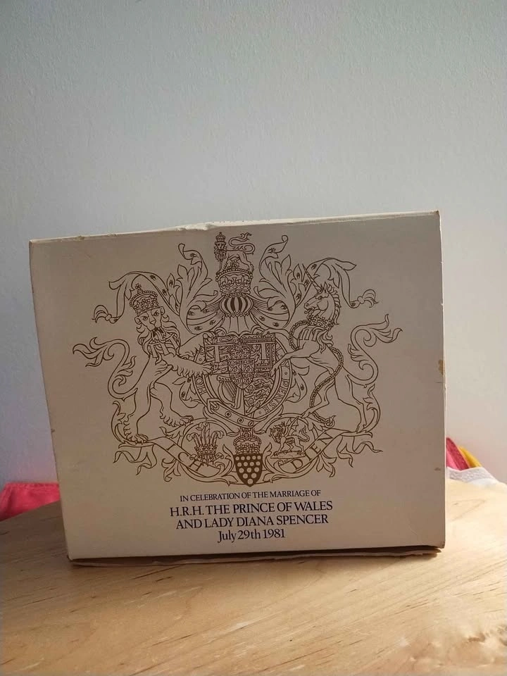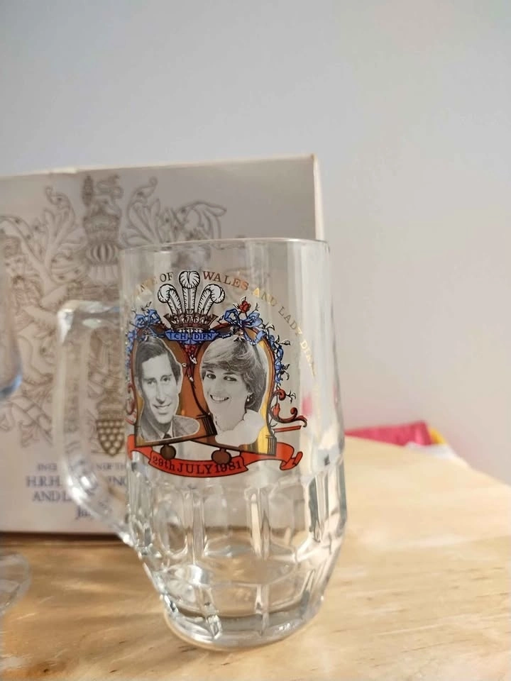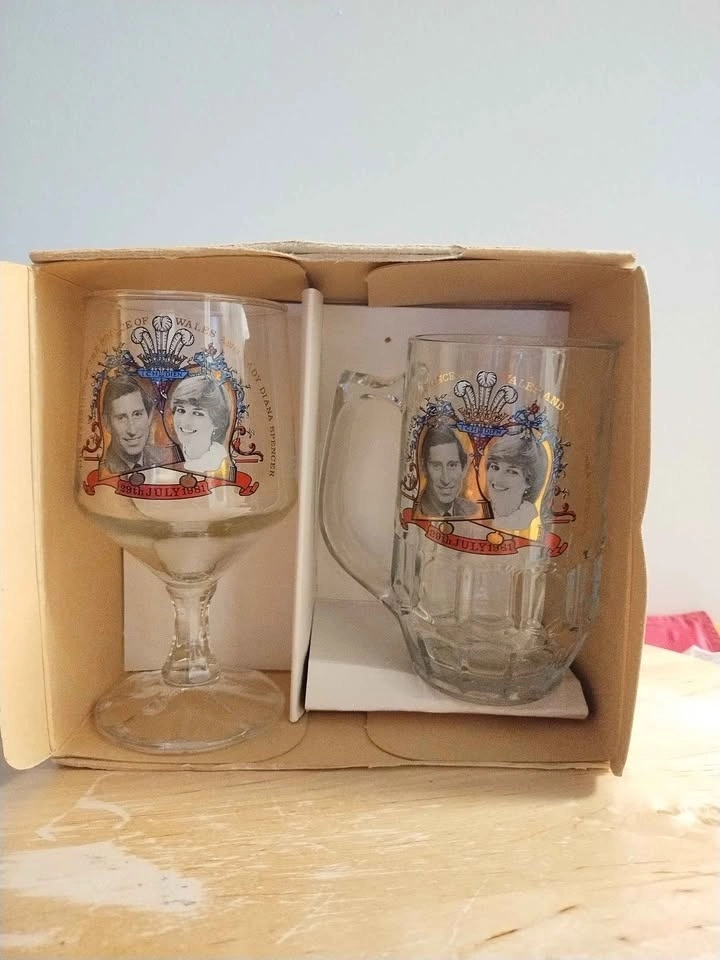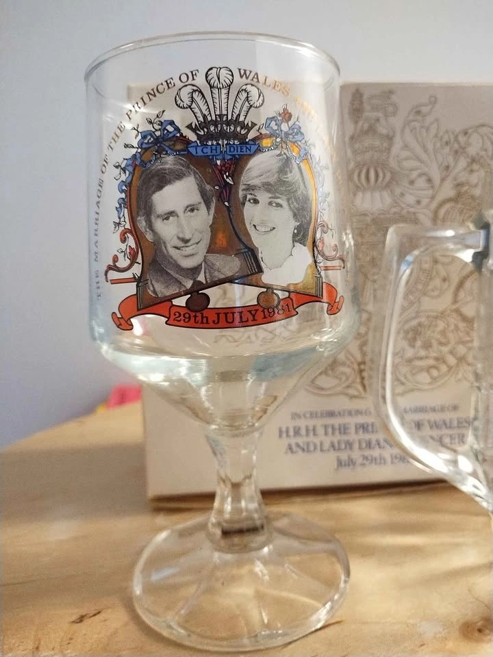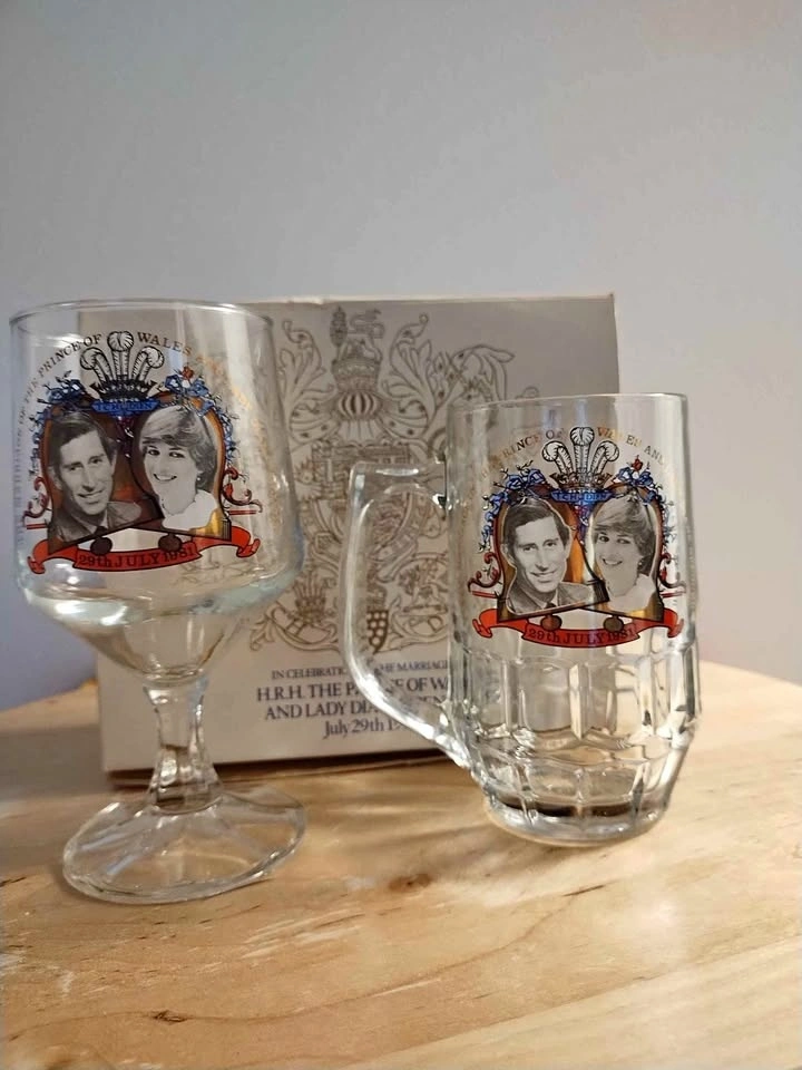 Pair of items created to commemorate the July 1981 wedding of Prince Charles and Lady Diana Spencer. One is a small glass mug, standing about 4.5" tall. The other is a 5.75" tall clear glass stemmed goblet. Both have the same image and banner showing the royal couple. No chips or cracks. The box is discoloured from age. (See photos).