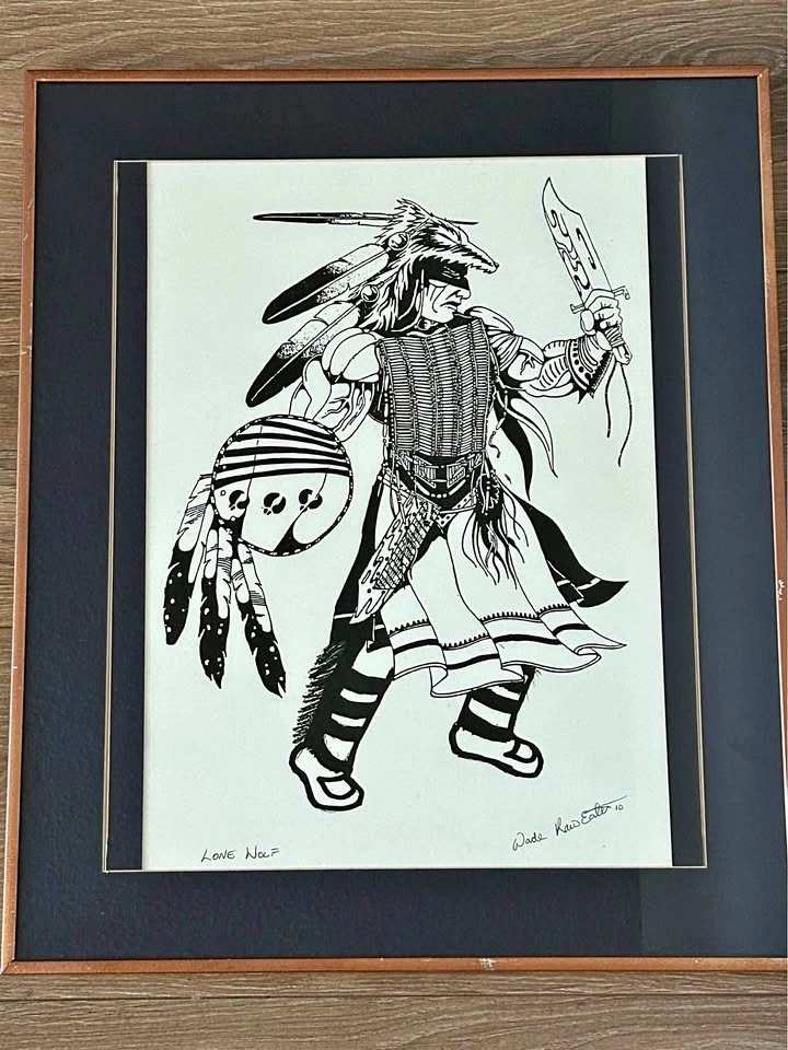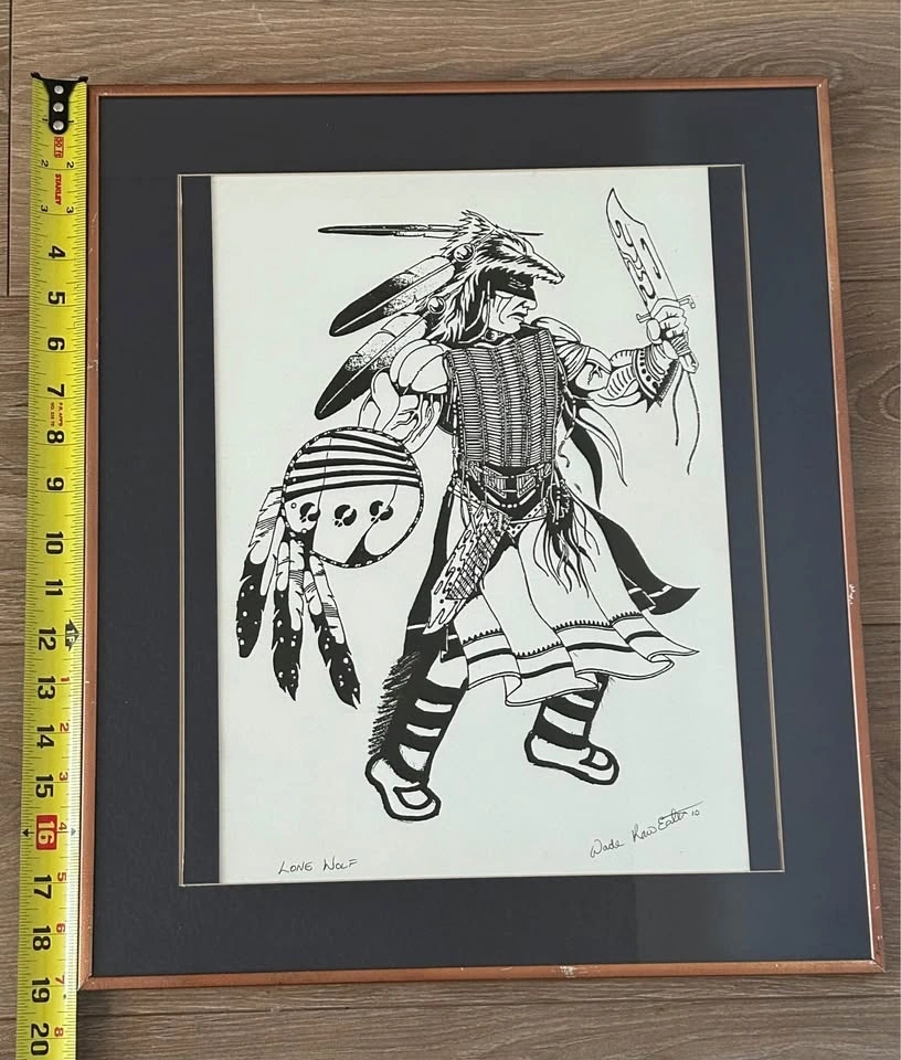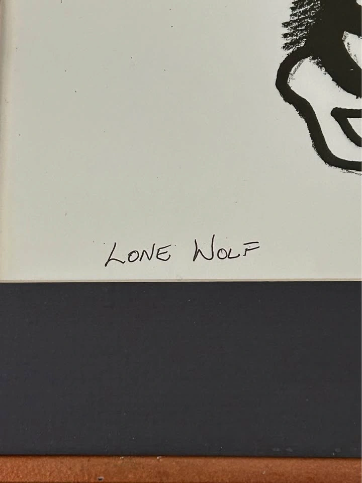 Beautiful Indigenous art print titled “Lone Wolf”, signed in pen by artist Wade RawEater (2010).