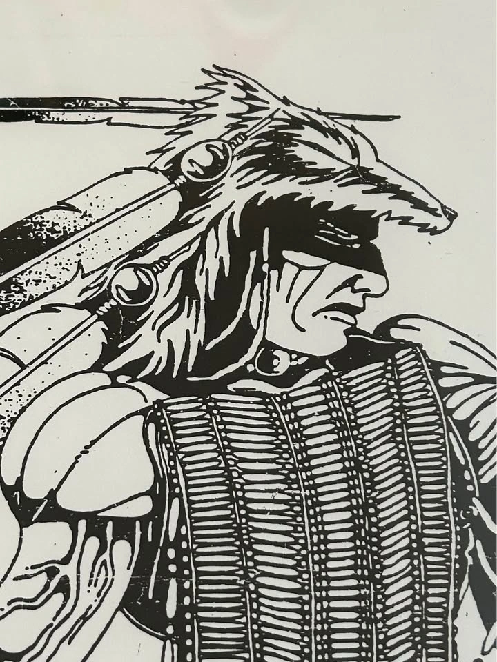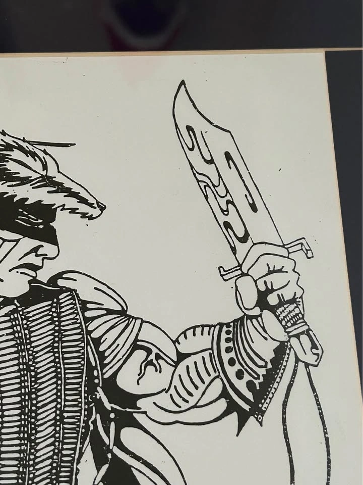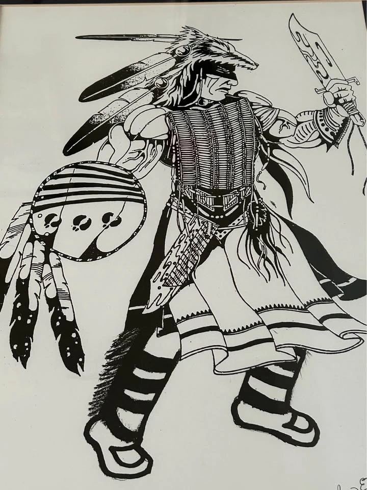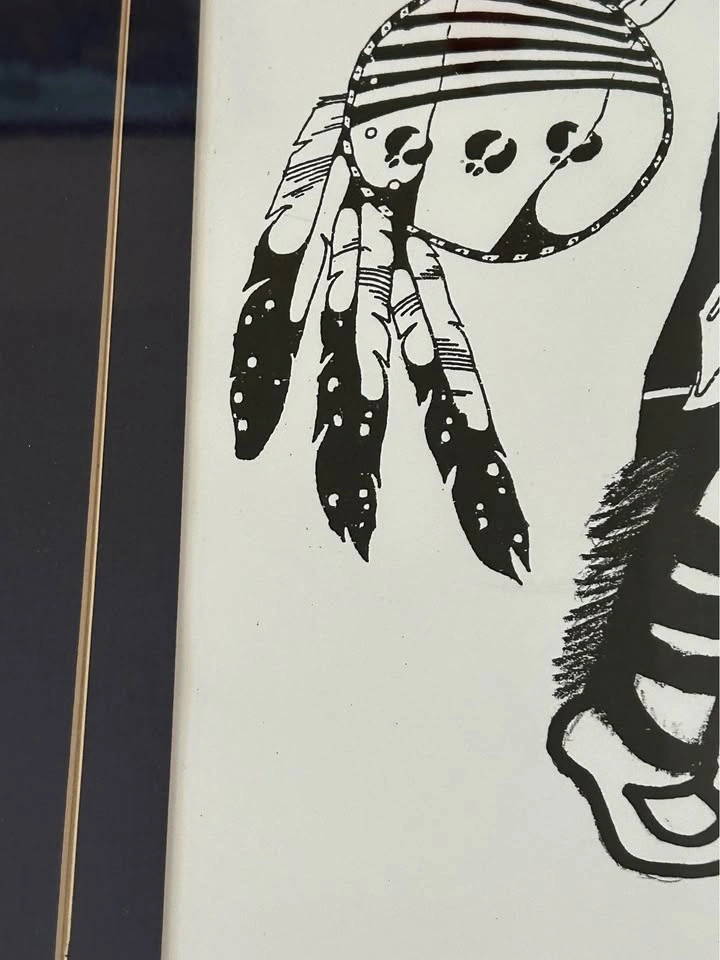 Bold black-and-white graphic style with strong traditional warrior imagery. The artwork is printed, and the signature is hand-signed by the artist.