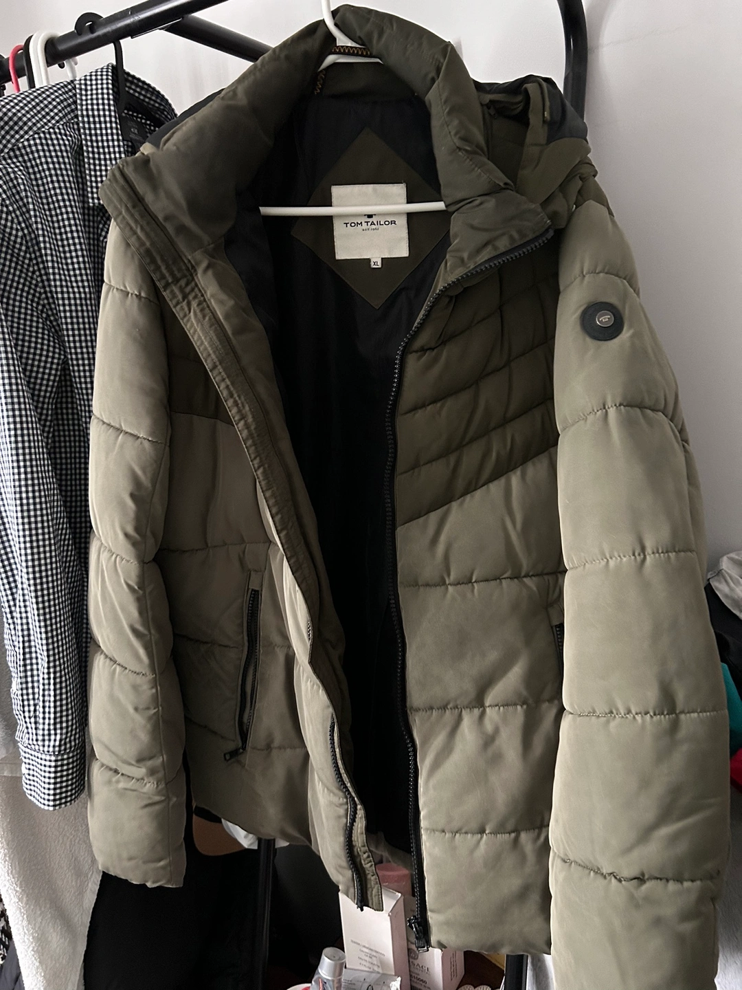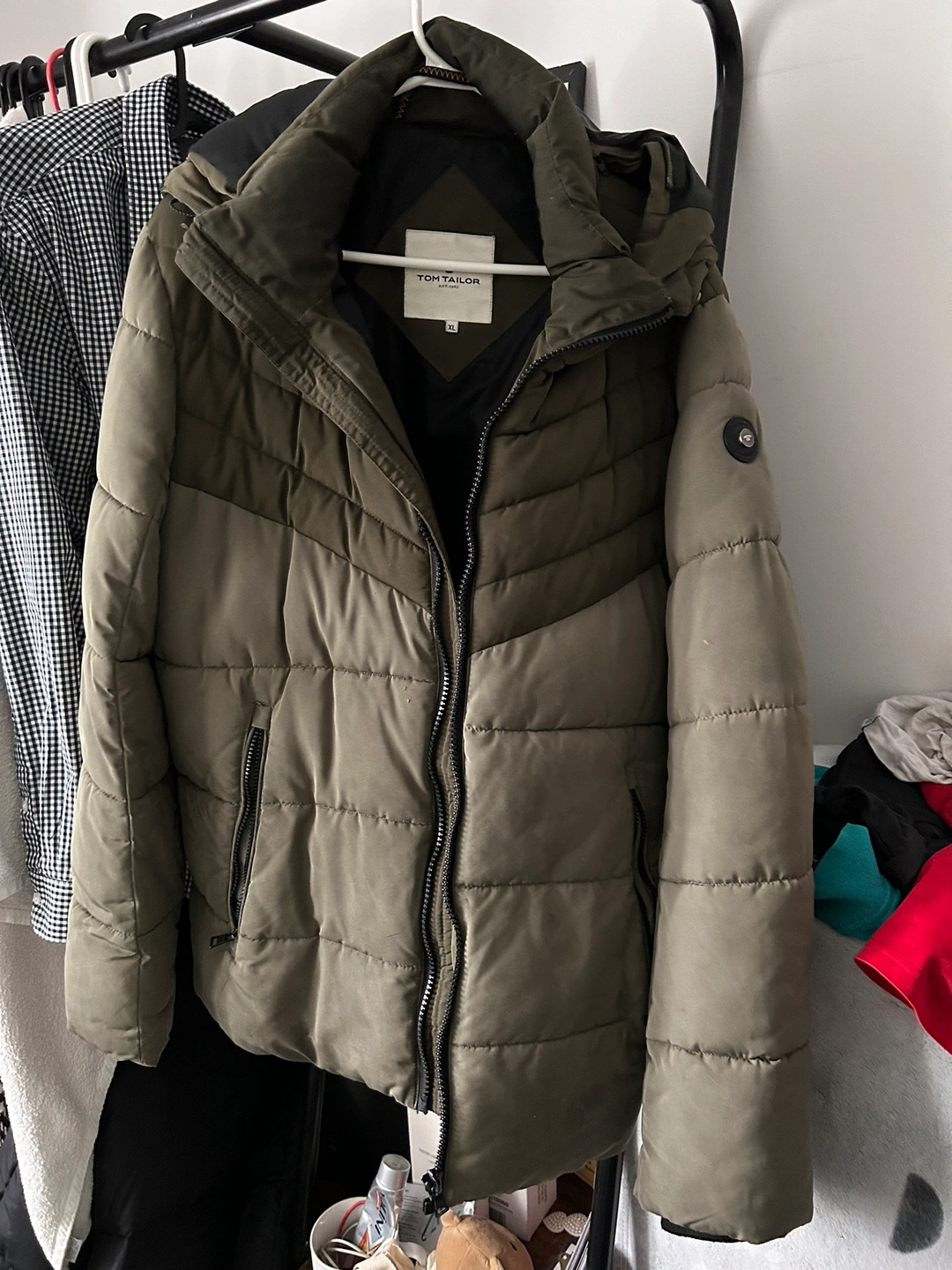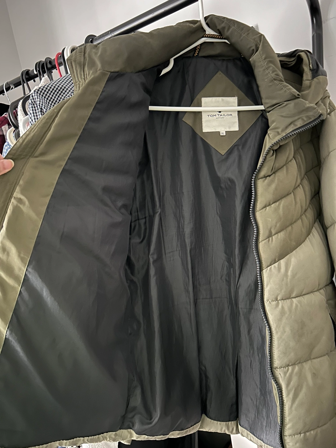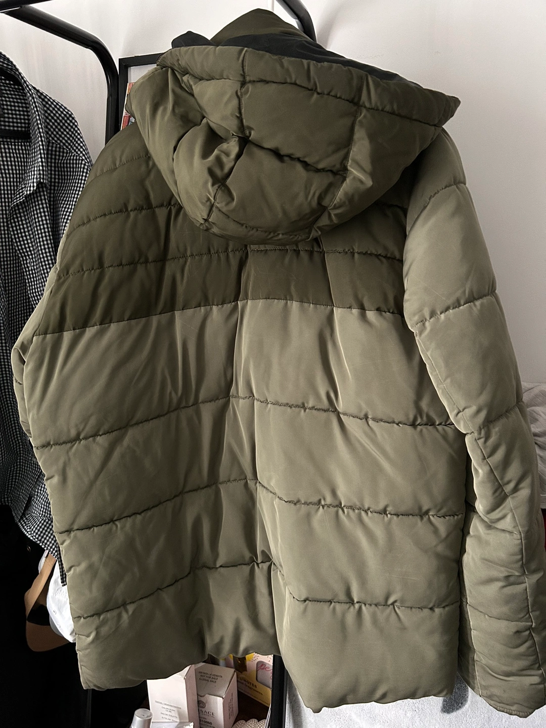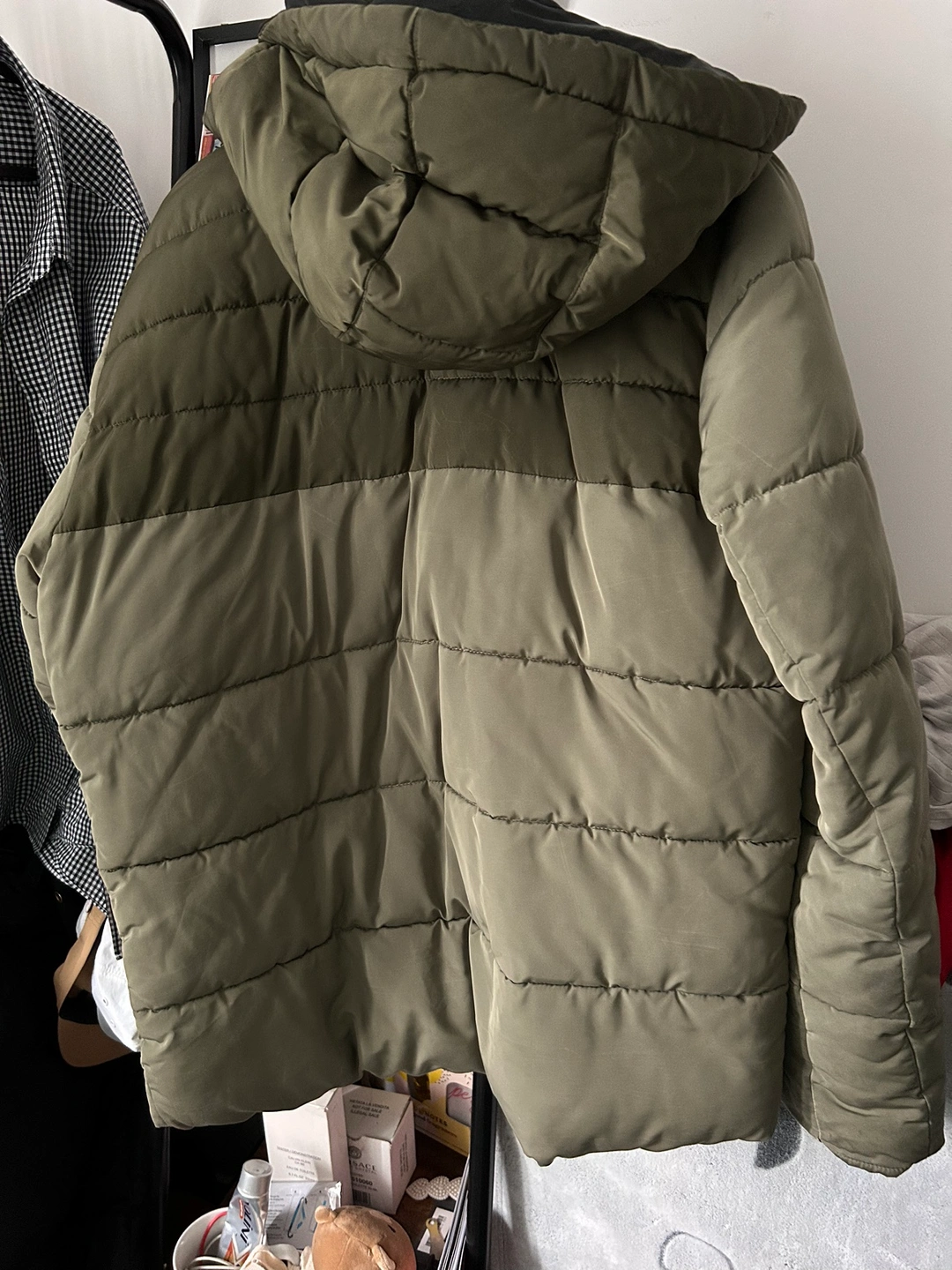 Green puffer jacket with a hood. The jacket is a size XL. It has two zippered pockets on the front and one zippered pocket on the inside. Bought it last winter. Have worn it comfortably upto -15to -18 degree last winters.I think it would be ok below that also but haven’t tried. Pick up near bay and temperance