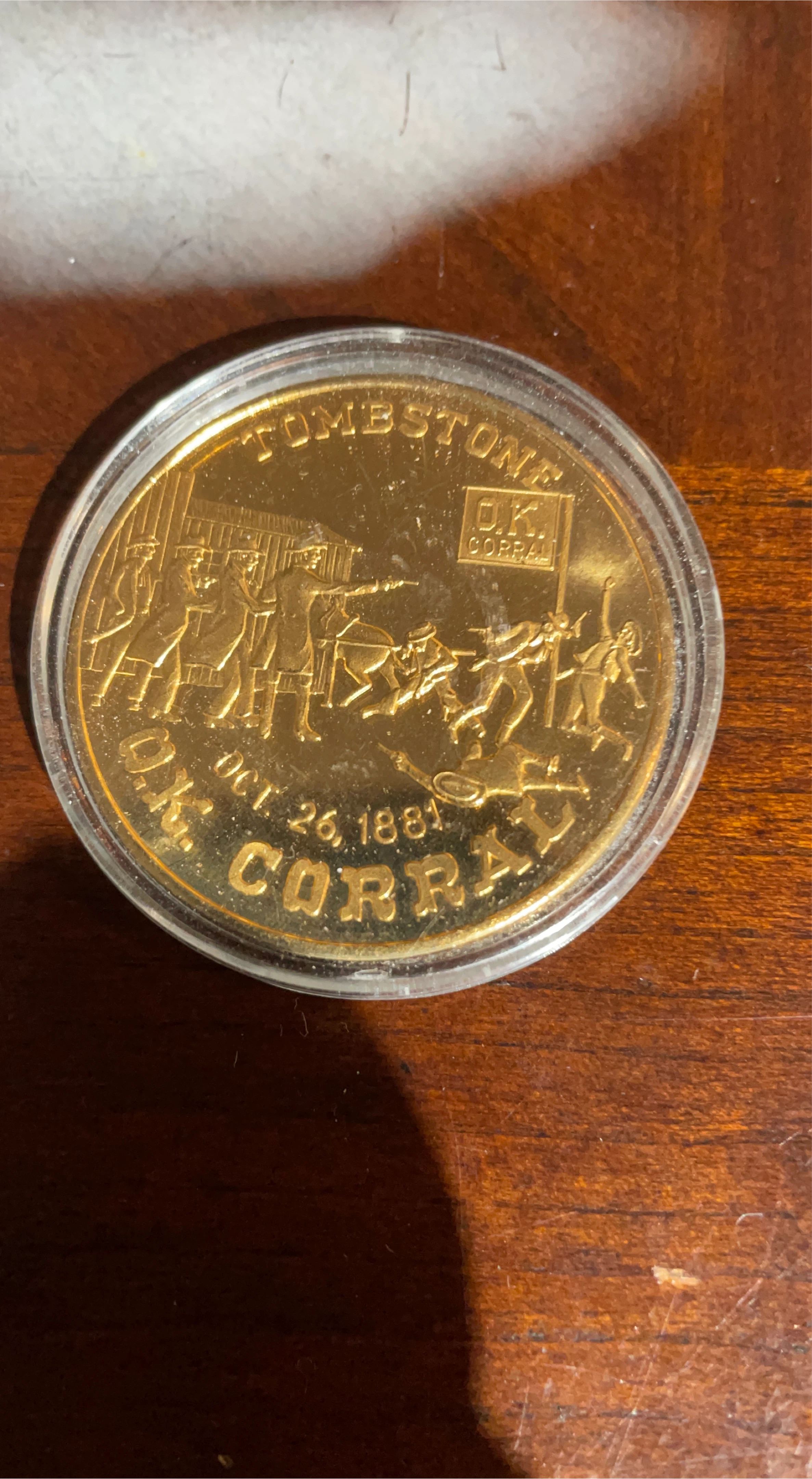 60Selling a commemorative coin from Tombstone, Arizona, marking the O.K. Corral shootout on October 26, 1881