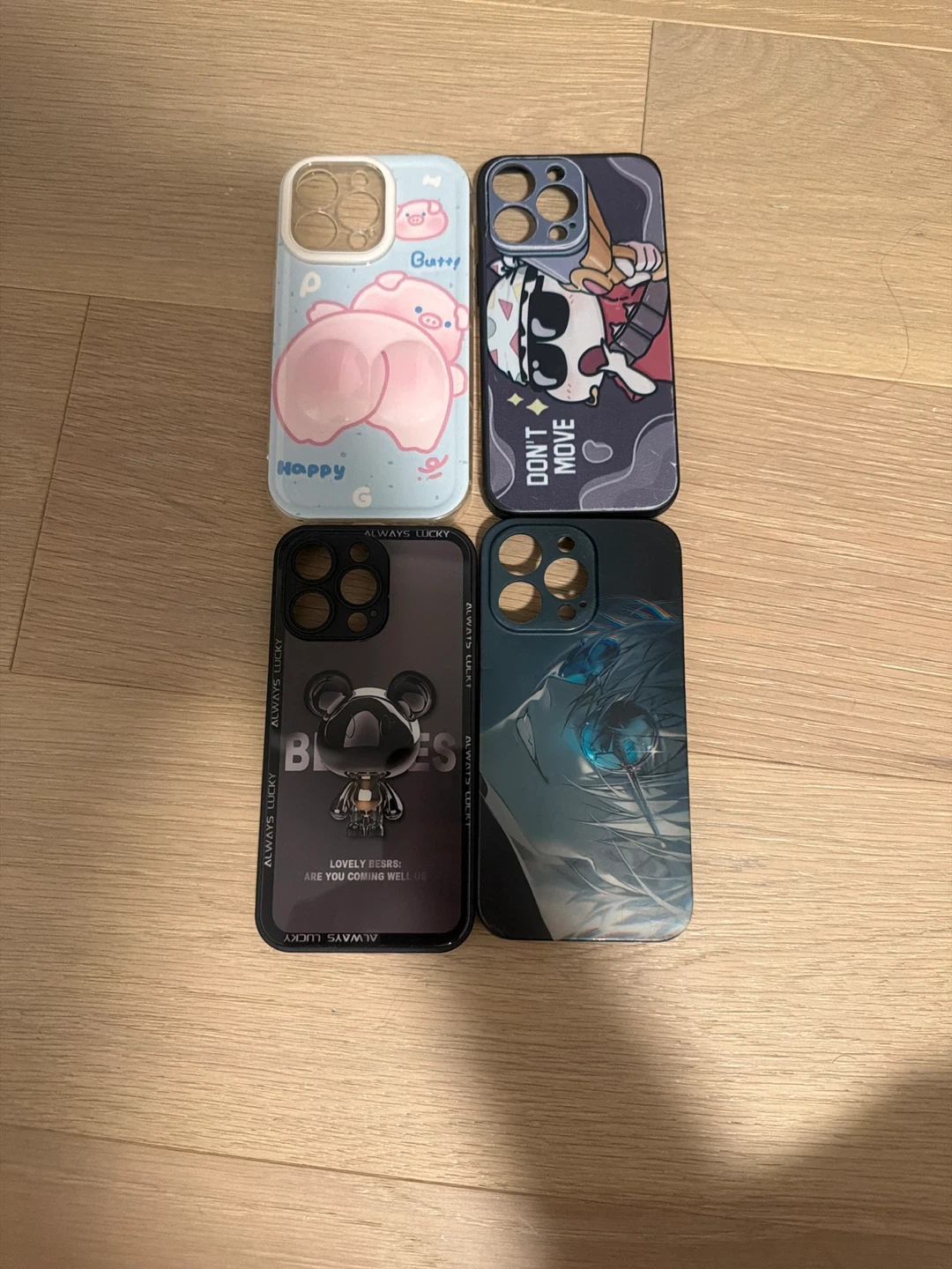 Includes one case with a cute pig design and text 'Happy Butt!', another with a cartoon character and 'DON'T MOVE' text. Also, one case featuring a shiny bear design with 'LOVELY BESRS' and a dark case with an anime-style character. All cases have 'ALWAYS LUCKY' printed along the sides. Cases designed for iPhones with multiple camera cutouts.