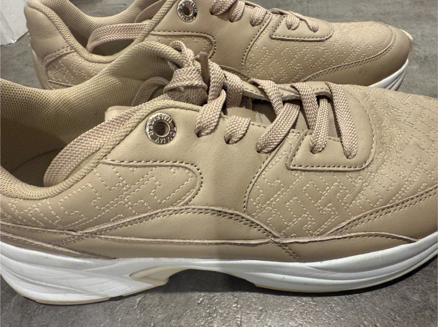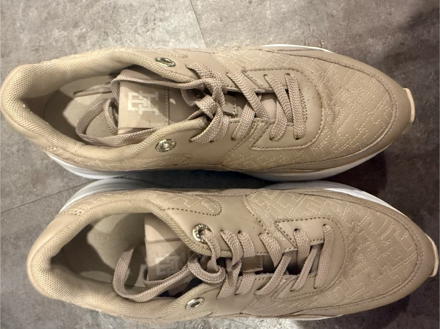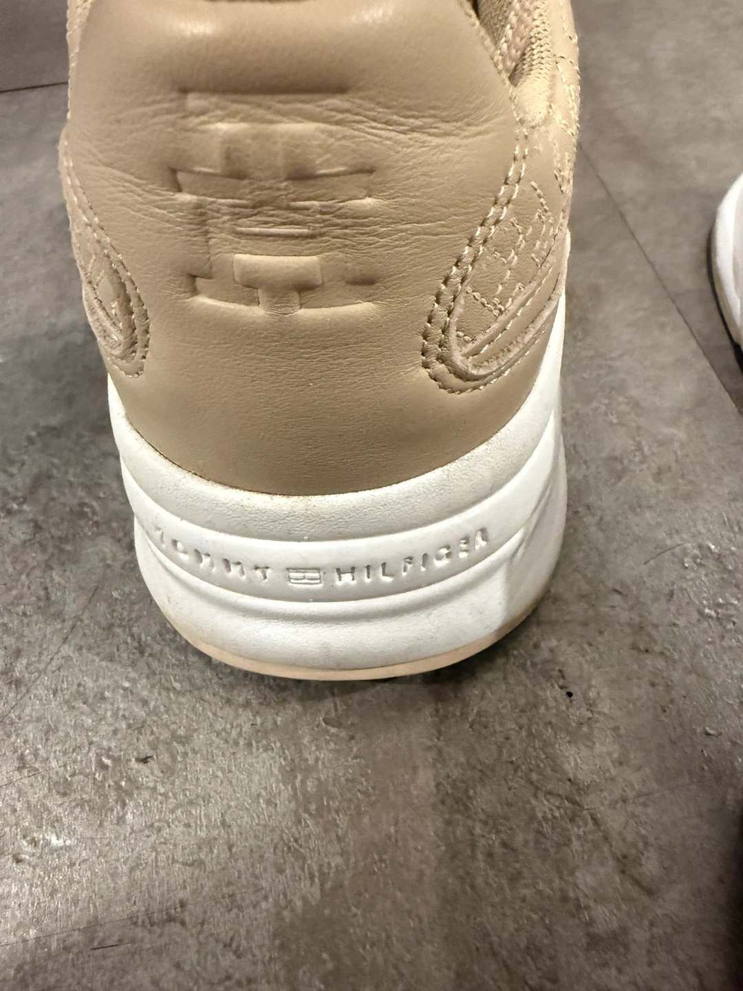 These are a pair of Tommy Hilfiger sneakers in a beige color. They have a unique patterned design on the upper and a white sole. They are in good condition and ready for a new home!