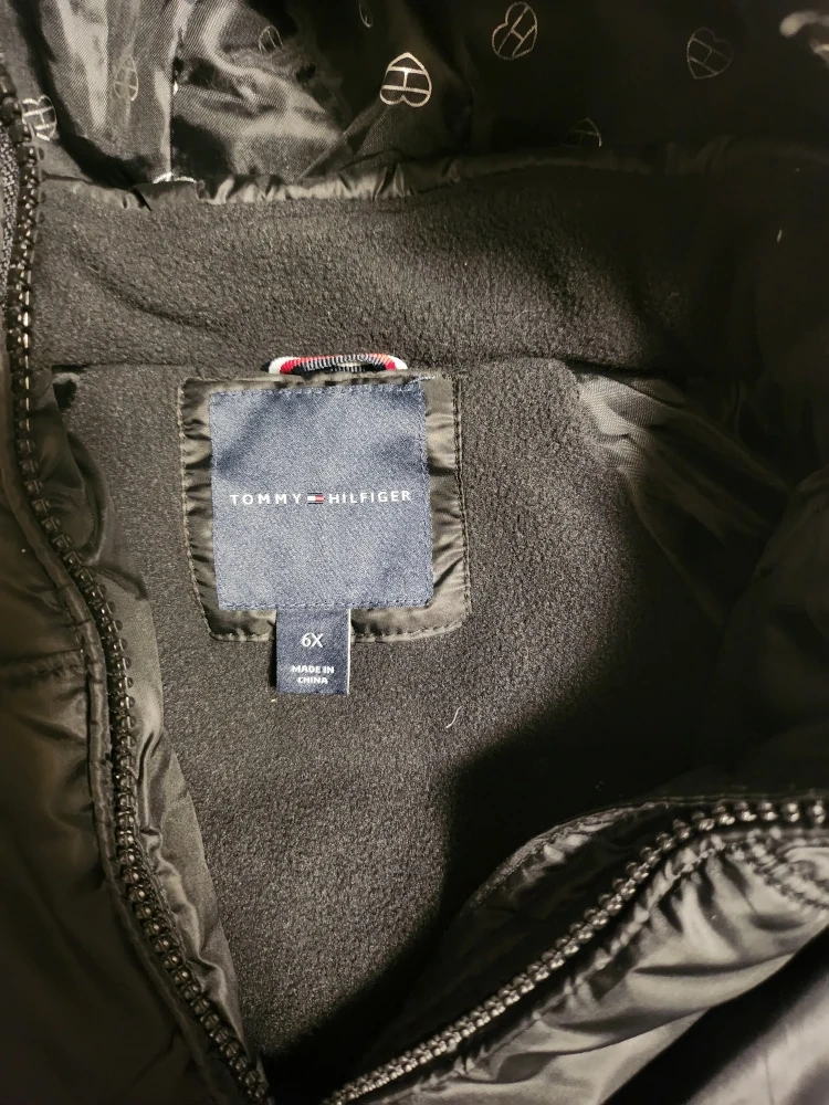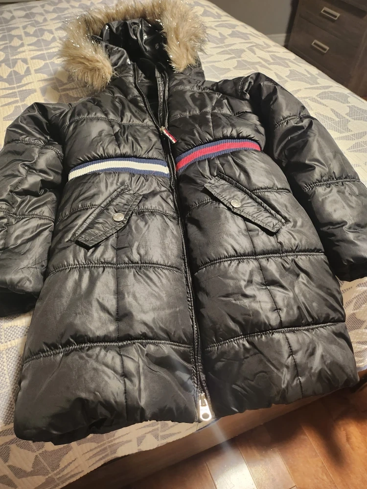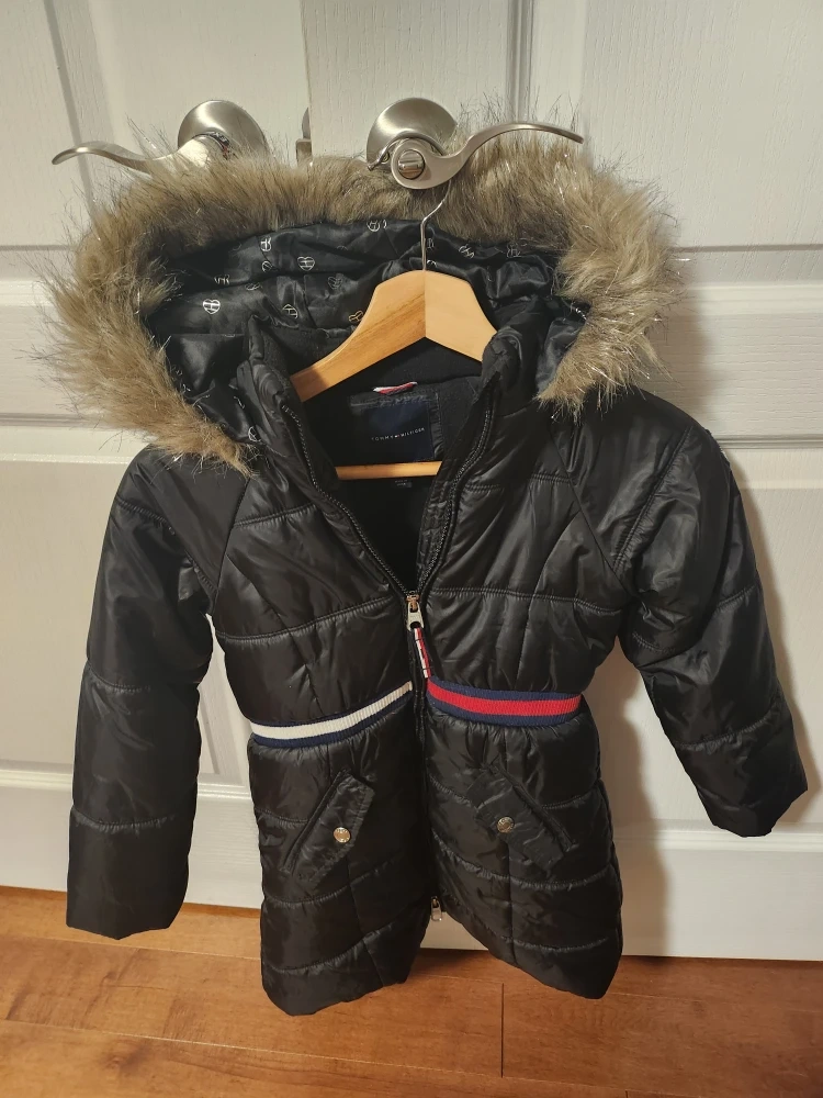 10Here's a gently used Tommy Hilfiger puffer jacket in size 6X. It's black with a faux fur-trimmed hood and a stylish striped detail across the front. Perfect for keeping your little one warm and cozy this winter!