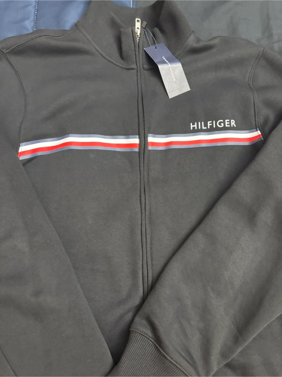 10Selling a brand new Tommy Hilfiger track jacket! It's black with the classic Hilfiger stripe across the chest. Still has the tags on it, so it's in perfect condition. Great for layering or wearing on its own