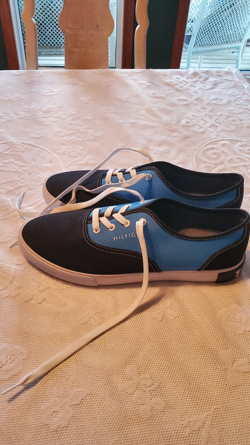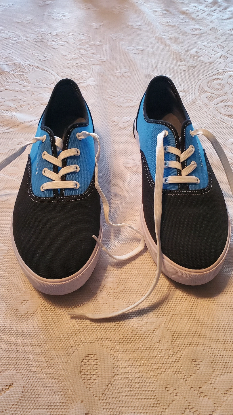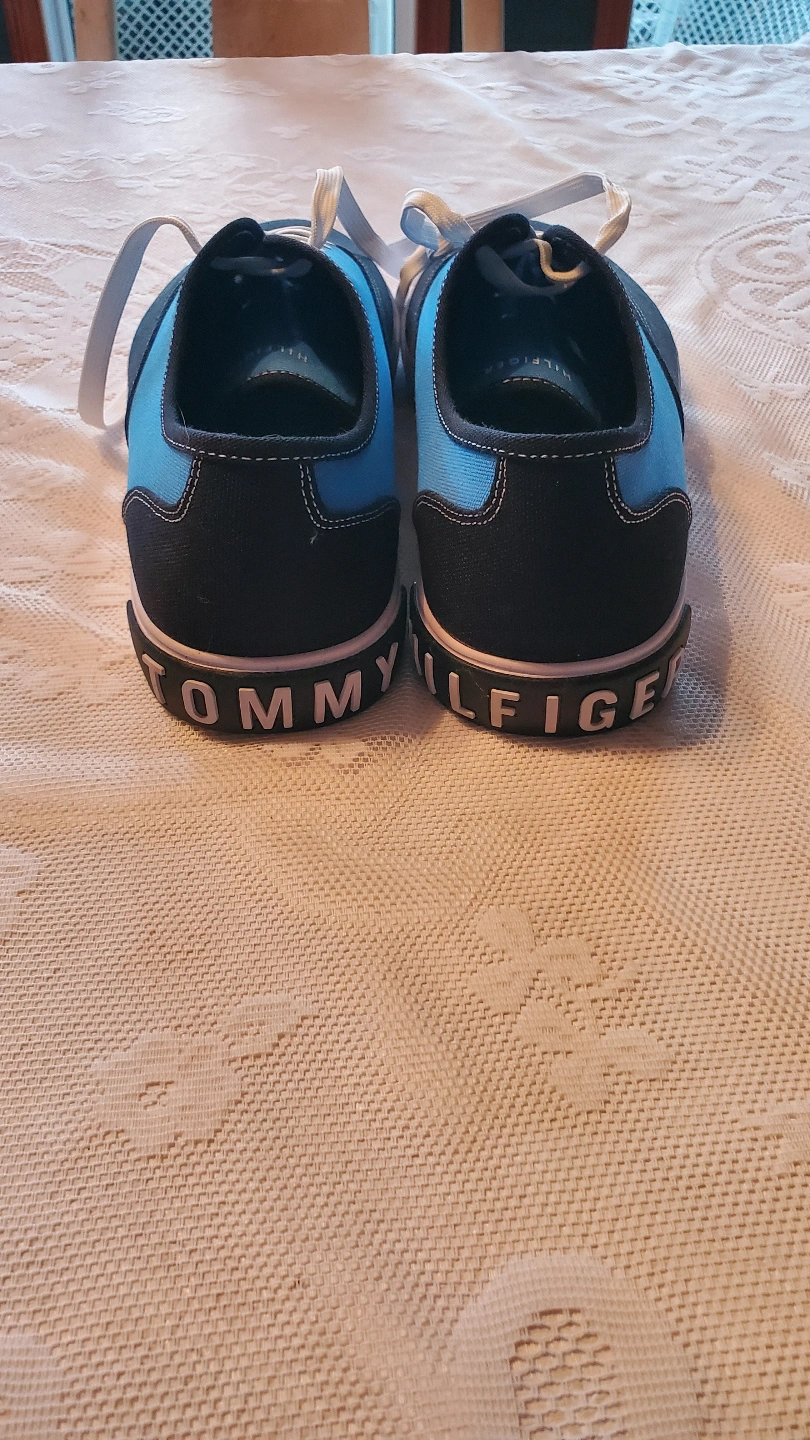 Pair of Tommy Hilfiger sneakers. Blue and black canvas upper. White laces. Low-top style. Good condition. Never worn. Pick up Dunmore or can drop off in Medicine Hat or surrounding area
