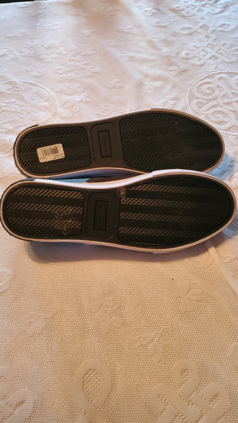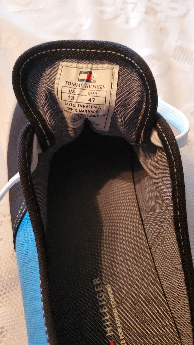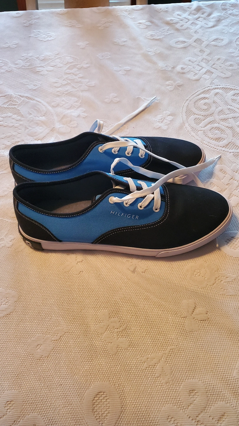 Pair of Tommy Hilfiger sneakers. Blue and black canvas upper. White laces. Low-top style. Good condition. Never worn. Pick up Dunmore or can drop off in Medicine Hat or surrounding area