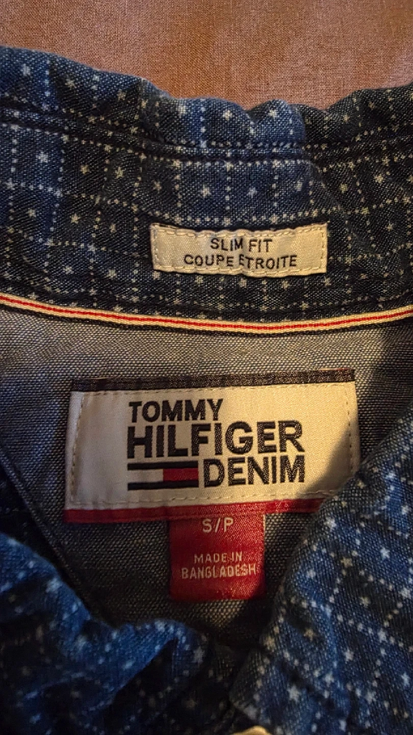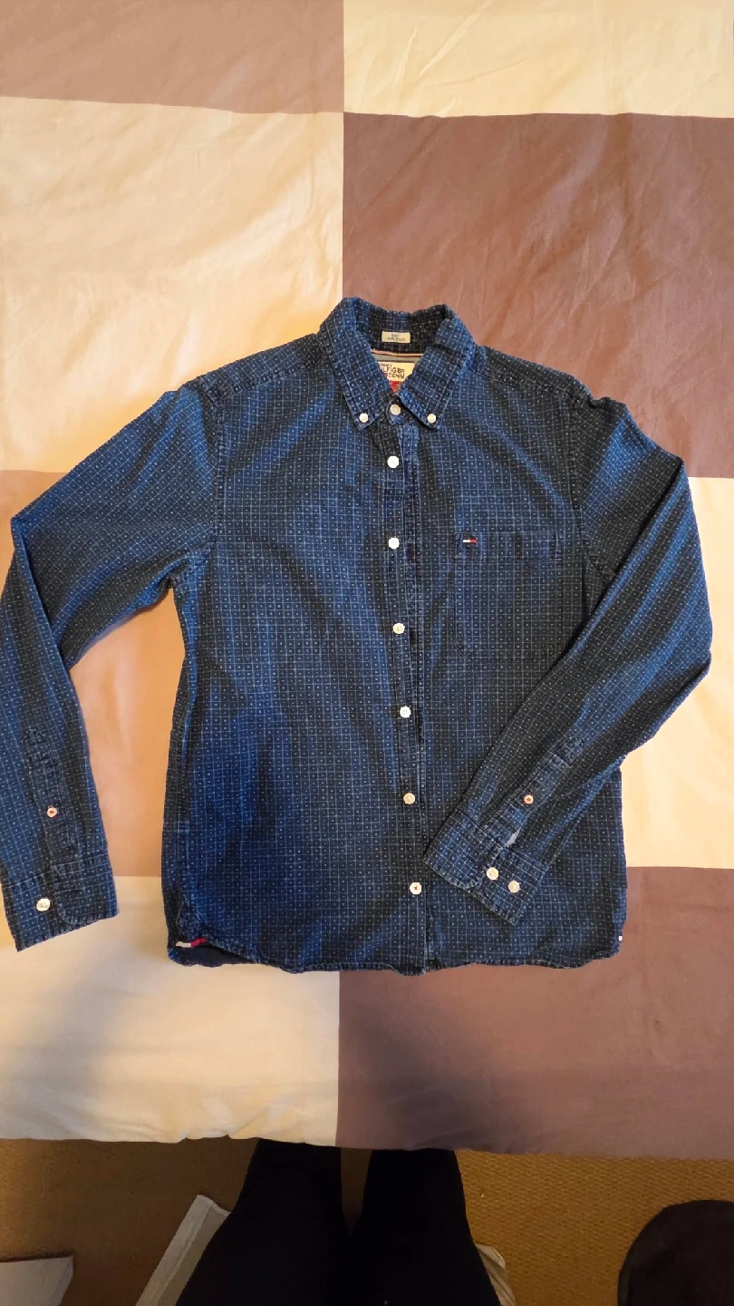 66Here's a Tommy Hilfiger denim shirt in size small! It's a slim fit and features a cool star pattern. Perfect for casual wear!