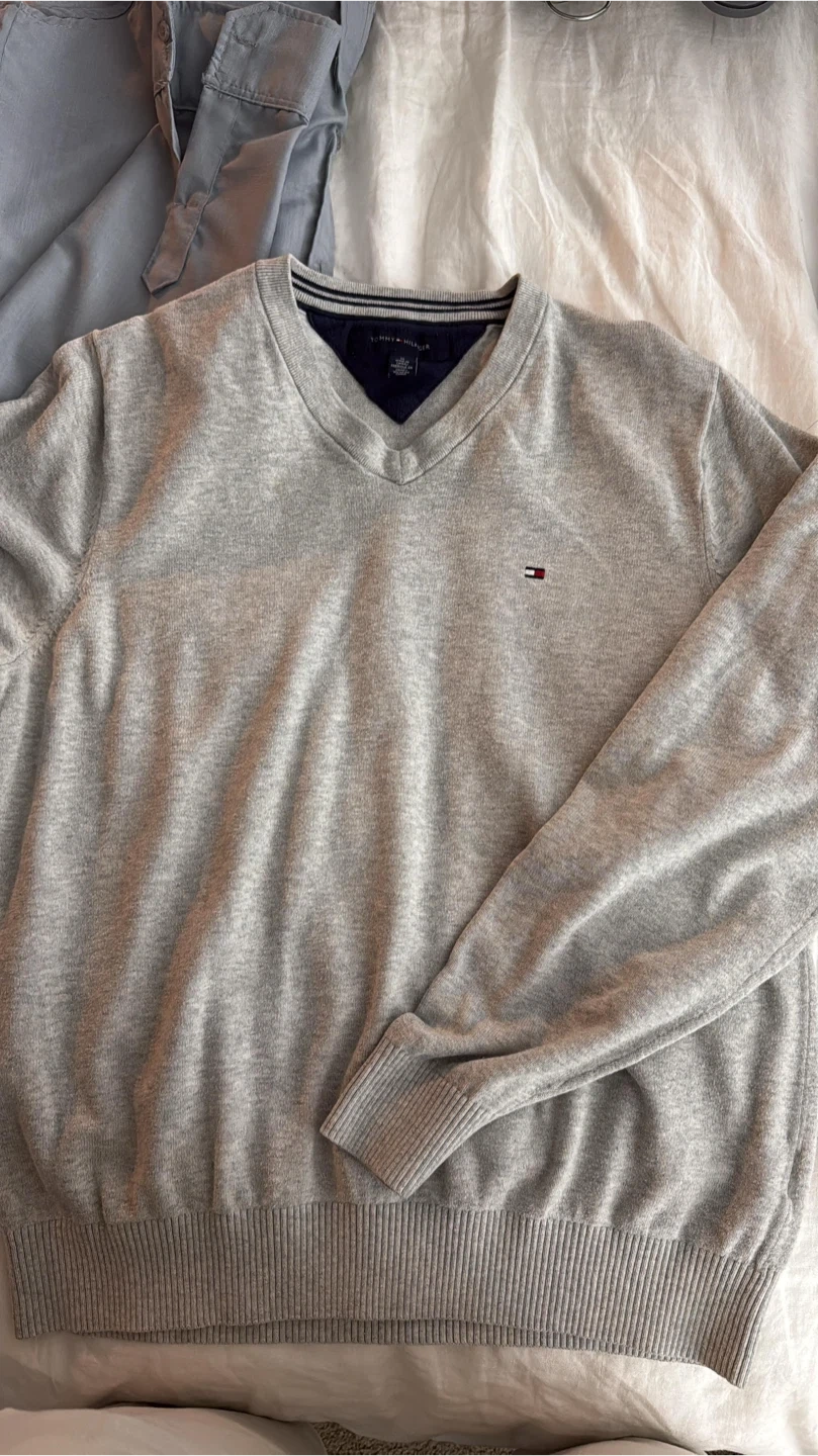 Selling a Tommy Hilfiger grey V-neck sweater. It's in great condition and perfect for layering during the cooler months! The sweater features the classic Tommy Hilfiger logo on the chest.