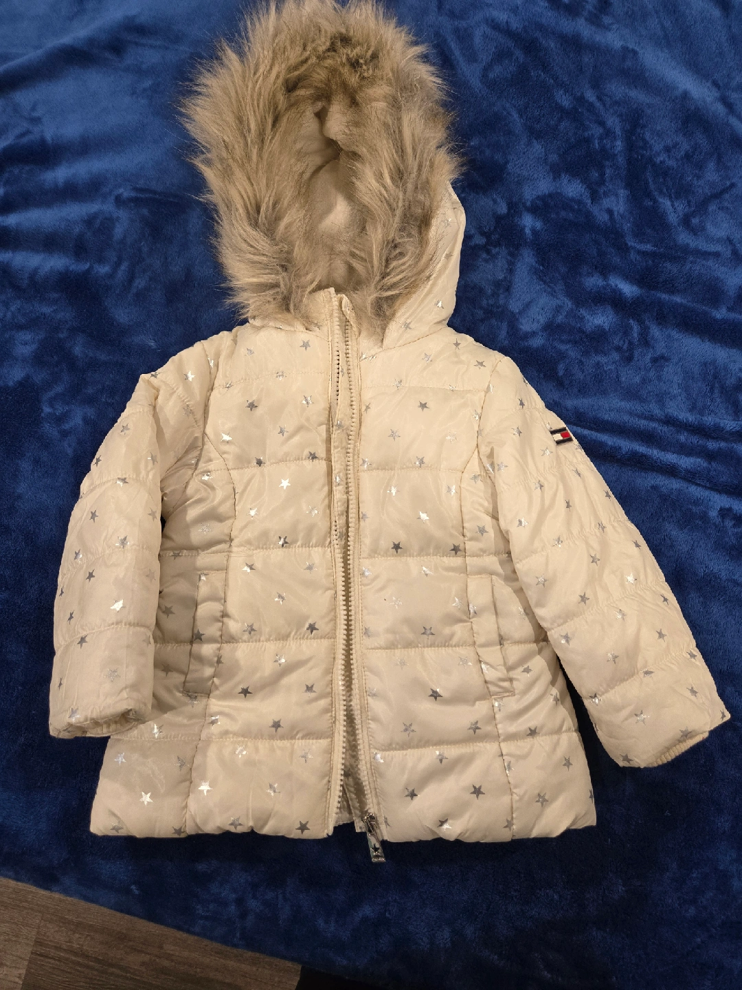 15Super cute Tommy Hilfiger puffer jacket for your little one! This jacket is in like new condition and features a faux fur hood and star pattern. - Brand: Tommy Hilfiger - Size: 18 Months - Color: Cream with silver stars - Faux fur hood Asking $40 OBO - paid around $50 plus taxes