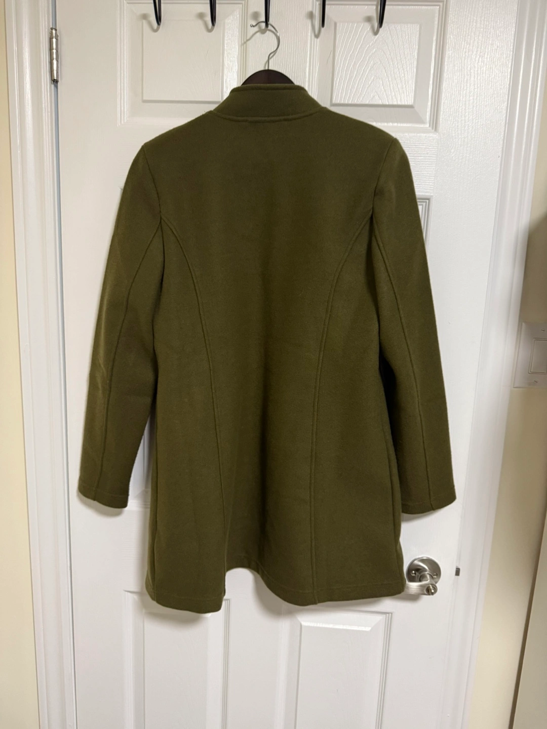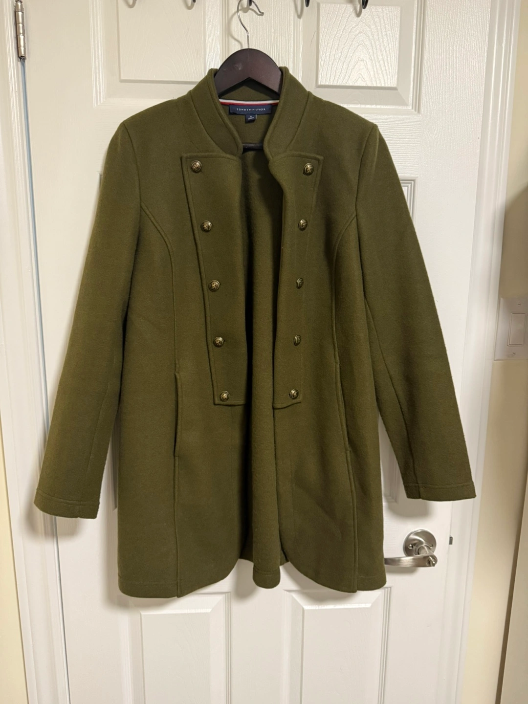 18This is a Tommy Hilfiger coat in a lovely olive green colour. It's in great condition and ready for a new home! The coat features a double-breasted design with gold-tone buttons, adding a touch of elegance to your wardrobe