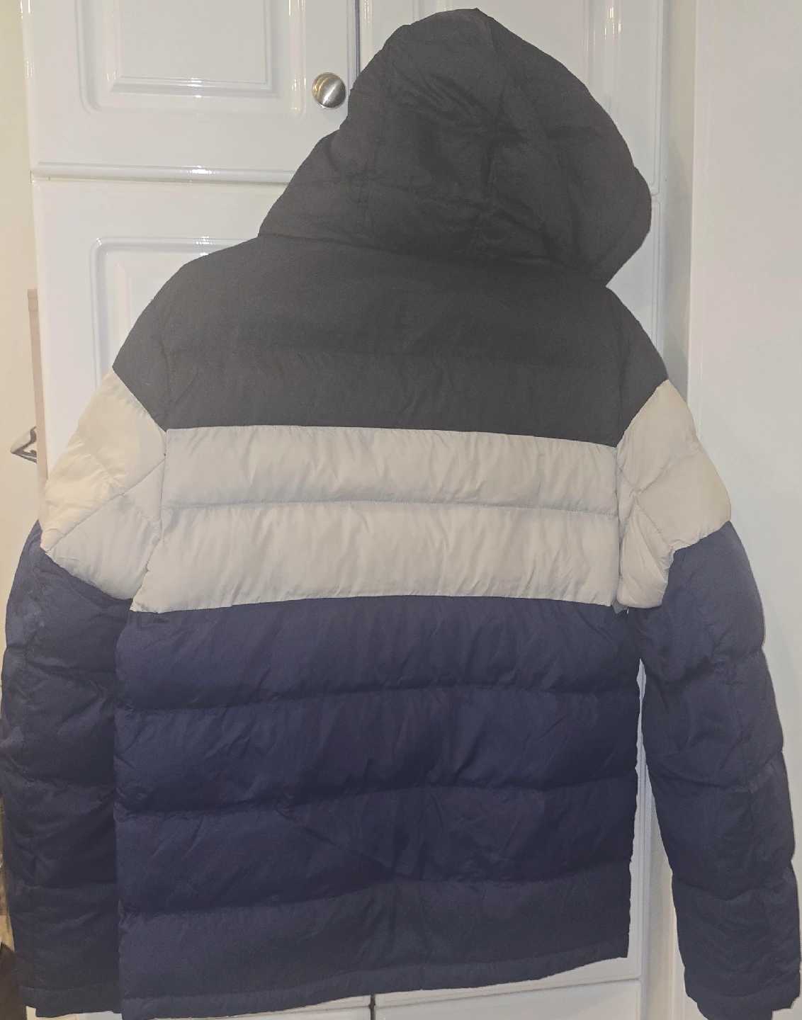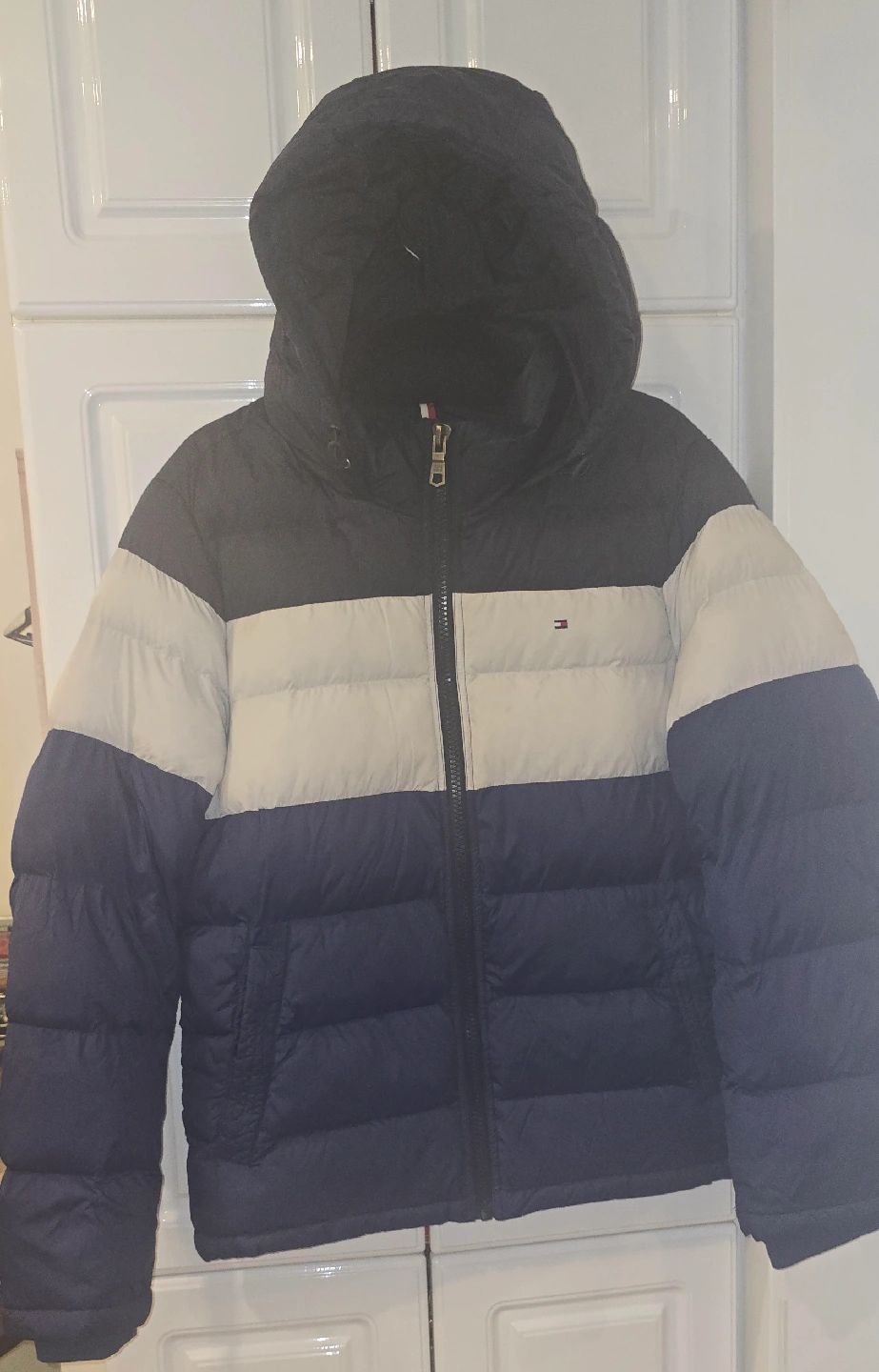 Tommy Hilfiger puffer jacket in great condition! The jacket features a colour block design in navy, white, and black. It's perfect for staying warm during the colder months. Let me know if you're interested!