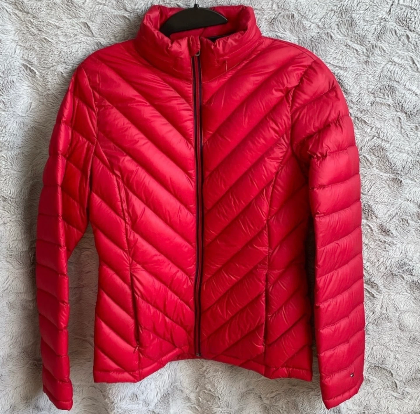 Lightweight Poly-filled puffer jacket Two zipper pockets Zip front closure Hidden hood Approx. measurements: length: 23”, shoulders: 17”, bust: 16”, sleeve: 24” EUC PFSF home