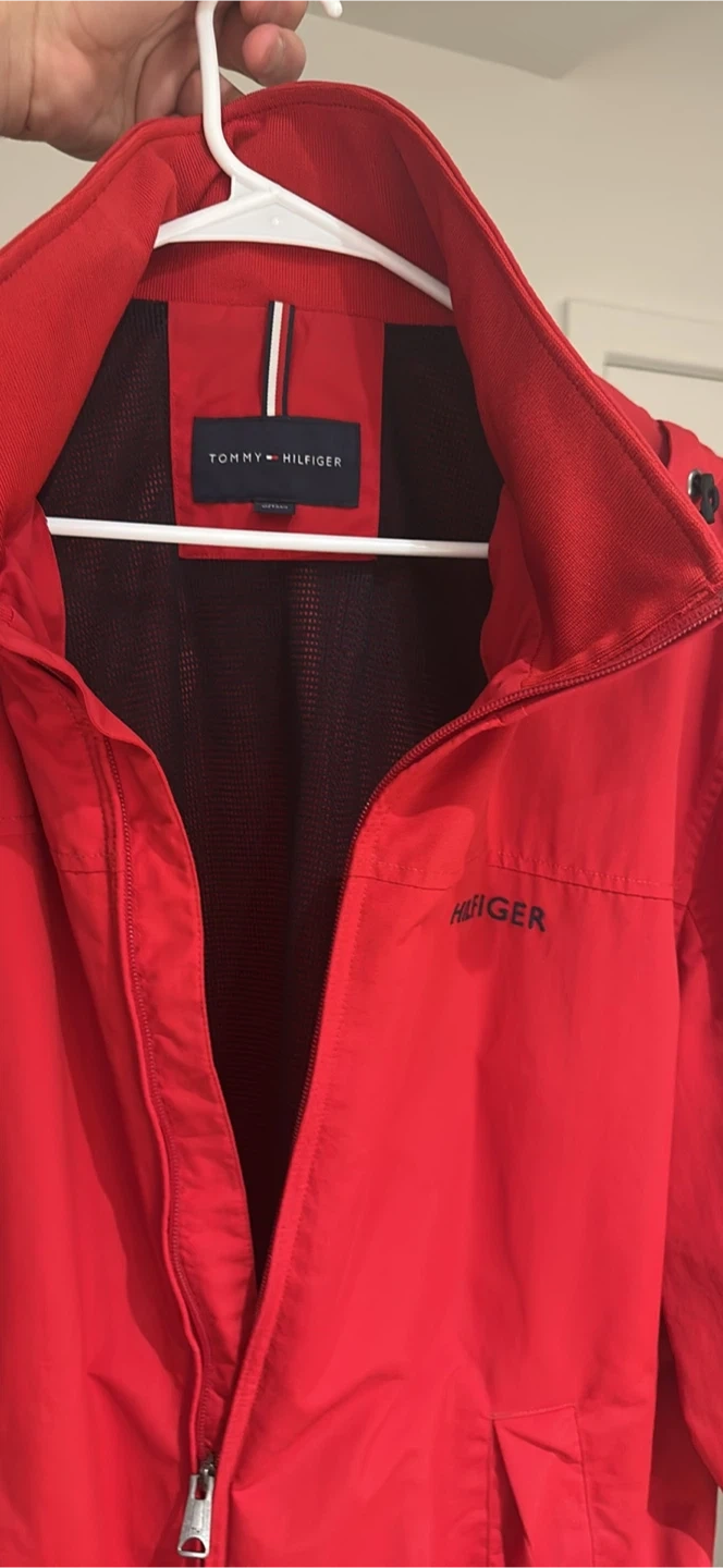 10Selling a Tommy Hilfiger hooded jacket in red. It's in great condition and Perfect for layering or wearing on its own during cooler days. The hood adds extra protection and the classic Tommy Hilfiger design ensures you'll always be in style