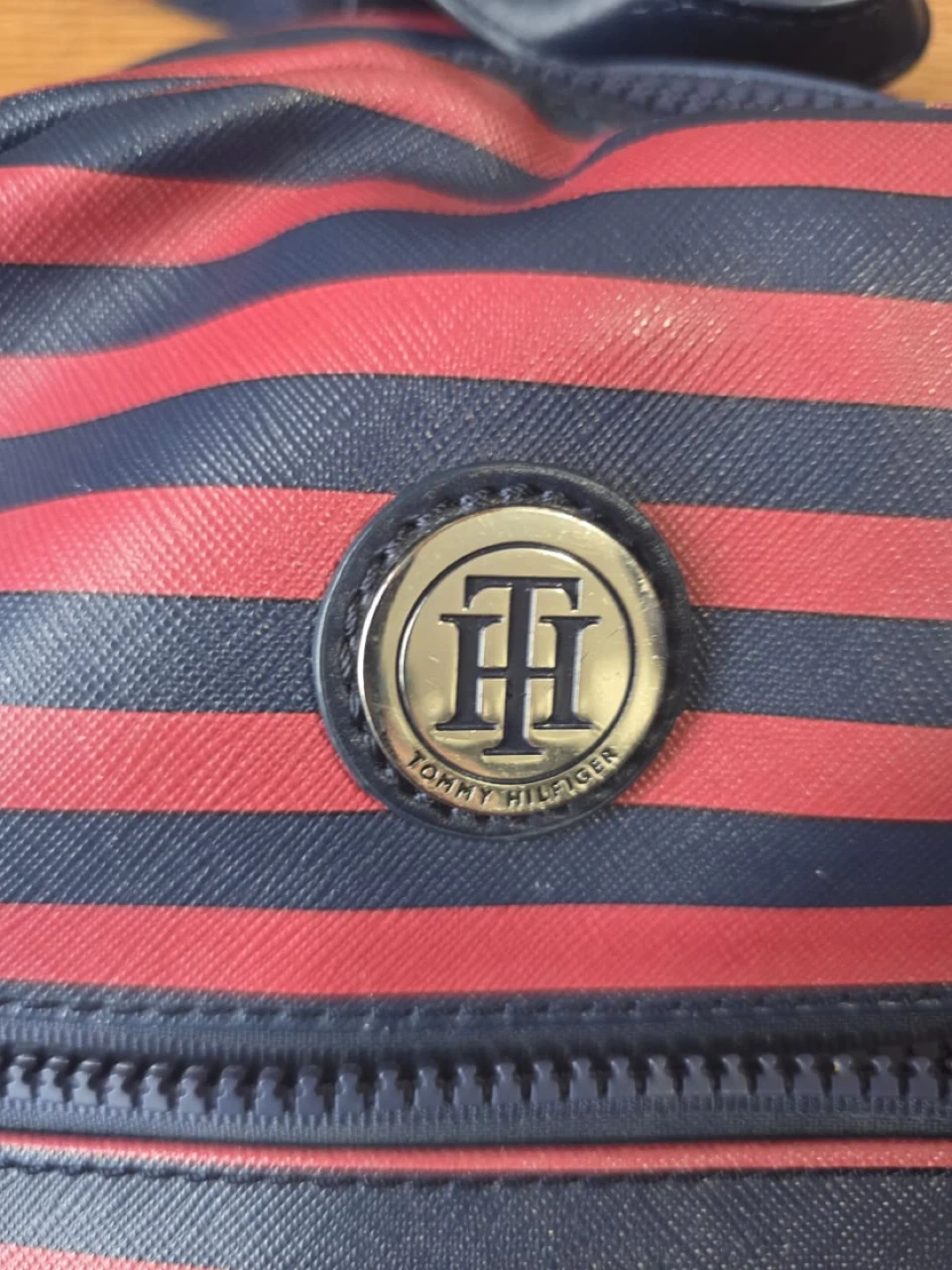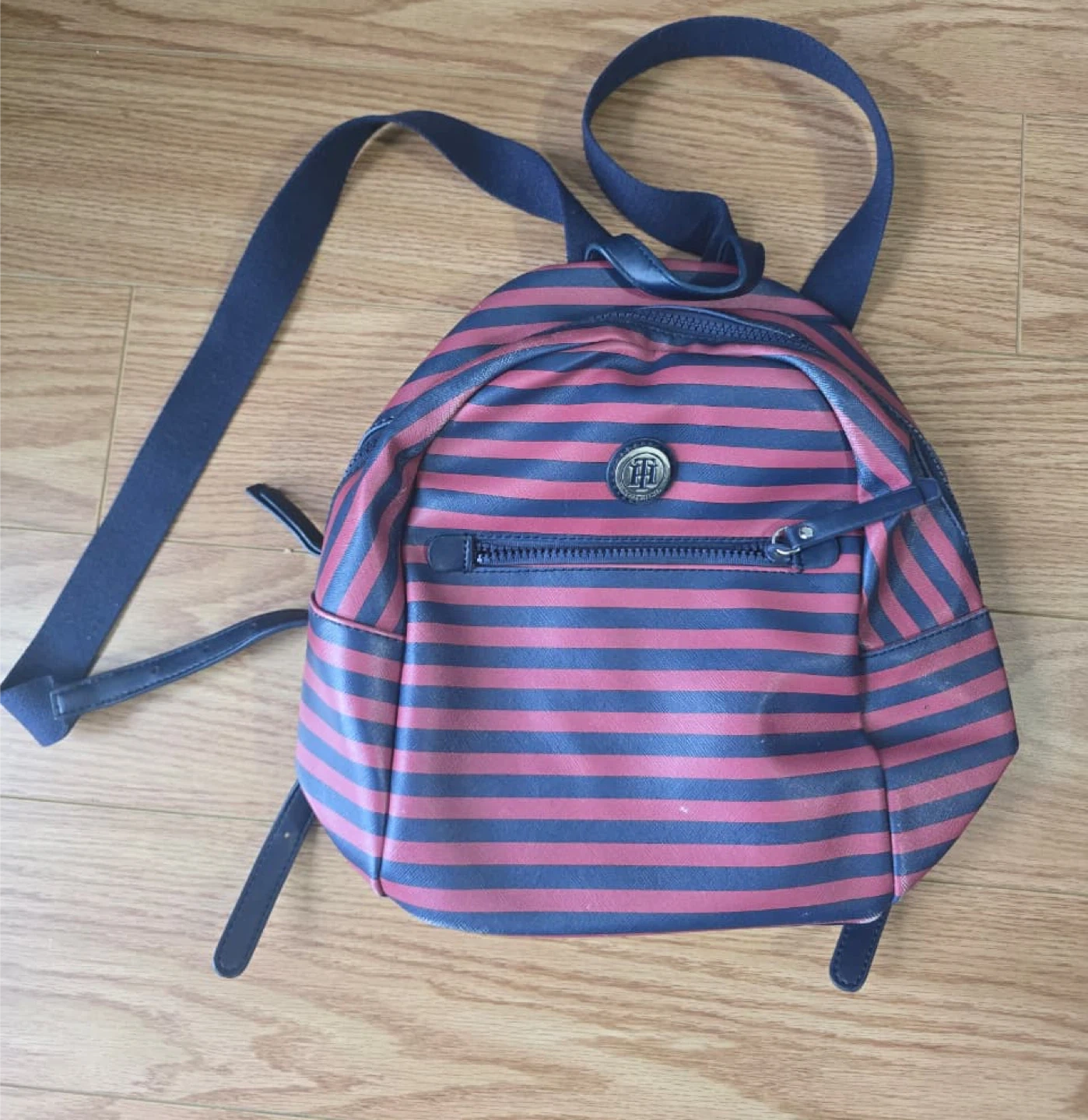 27Tommy Hilfiger backpack with a striped design. It features a front zipper pocket and adjustable straps