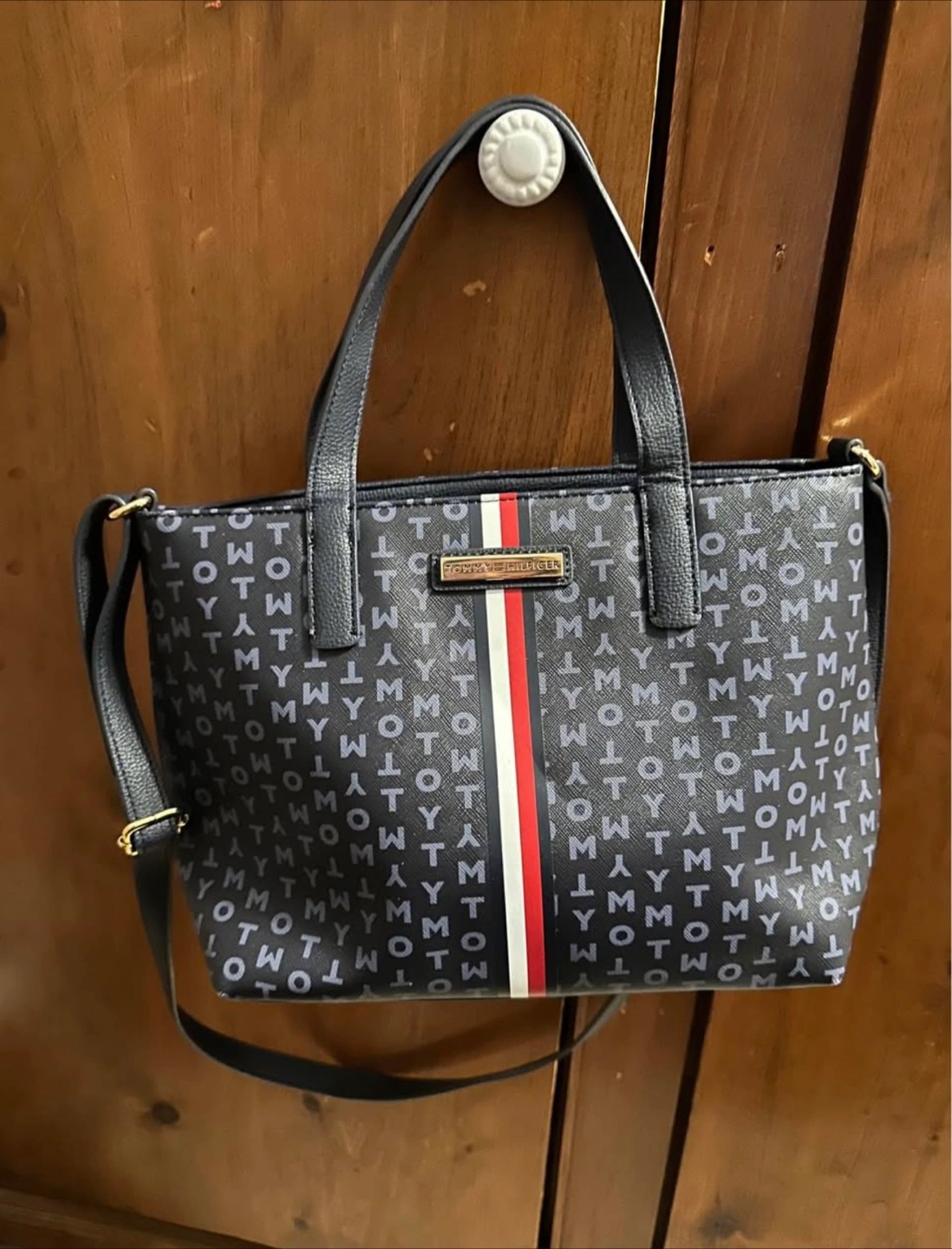 73Tommy Hilfiger tote bag featuring the brand's logo and signature red and white stripe. It's in great shape and ready for a new home!