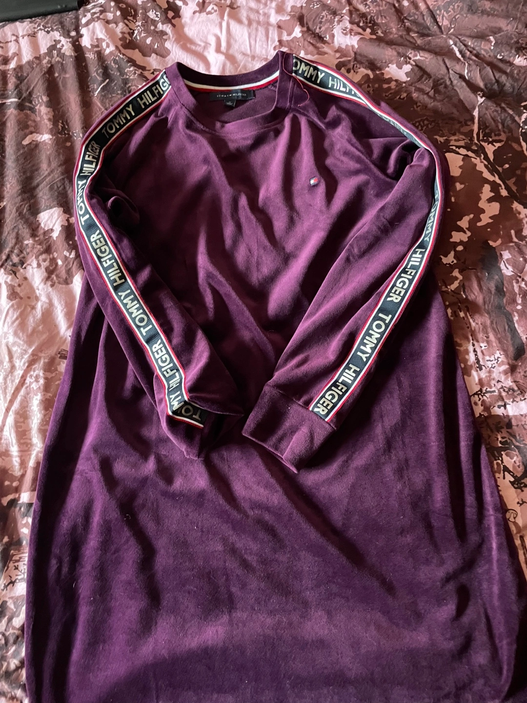 Burgundy velour long-sleeve mini dress. Features Tommy Hilfiger branding on sleeves. Relaxed fit. PM for more detailed images / information.