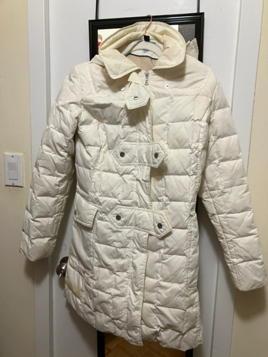 Size Medium, thin on the inside but nice for light spring weather or layering. If you look closely at the bottom left corner of the picture, there is a yellow stain on the corner of a pocket.