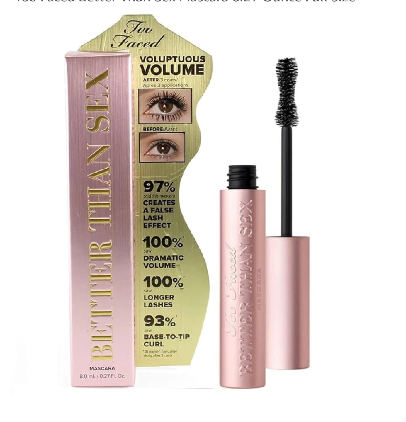 44Brand New!!! Unopened. [Free w/ the purchase of at least any of my other listings] Giving away a Too Faced Better Than Sex Mascara! As long as you purchase my other listings. It creates a lash effect, dramatic volume, longer lashes, and base-to-tip curl. It's 8.0 ml / 0.27 Fl. Oz