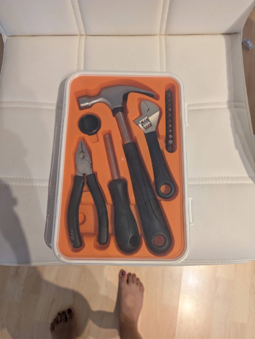 21Handy tool set with a variety of essential tools. Includes a hammer, wrench, pliers, screwdriver, and various bits, all neatly organized in a case
