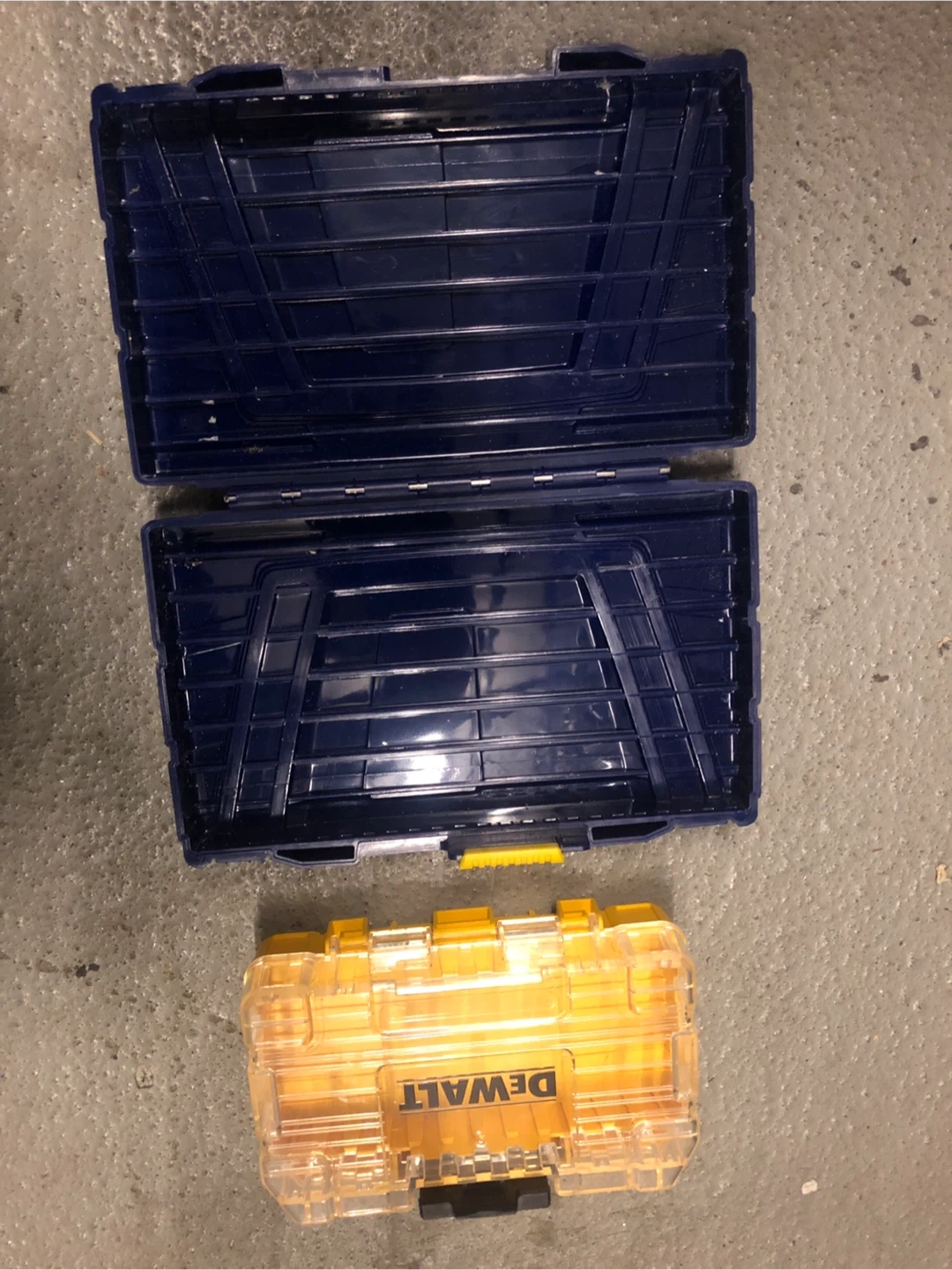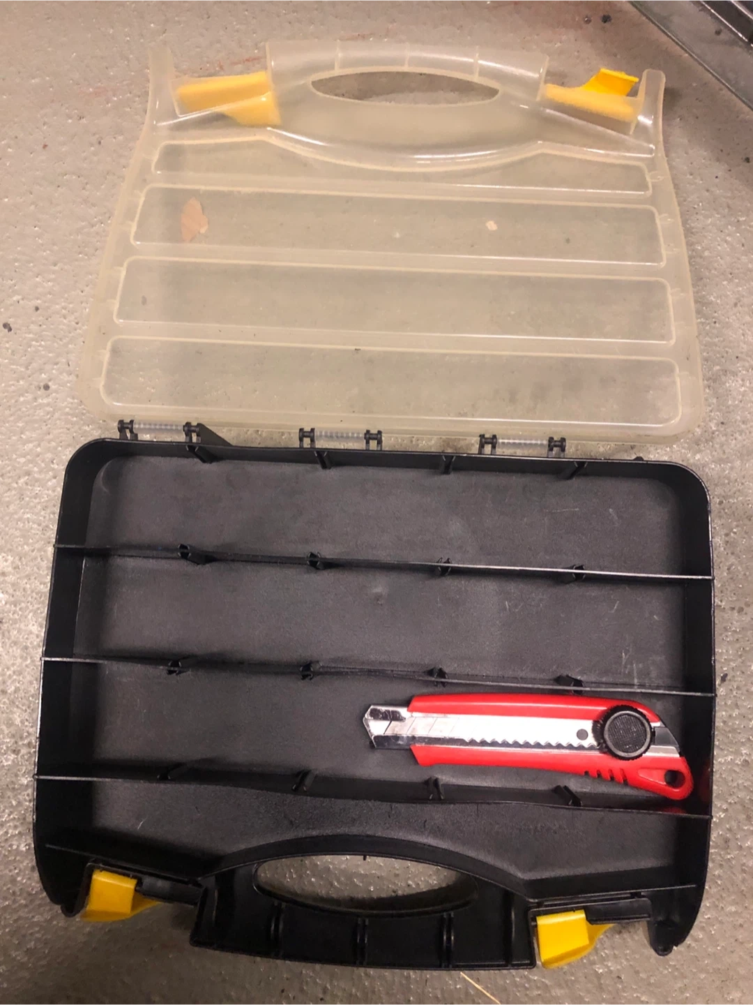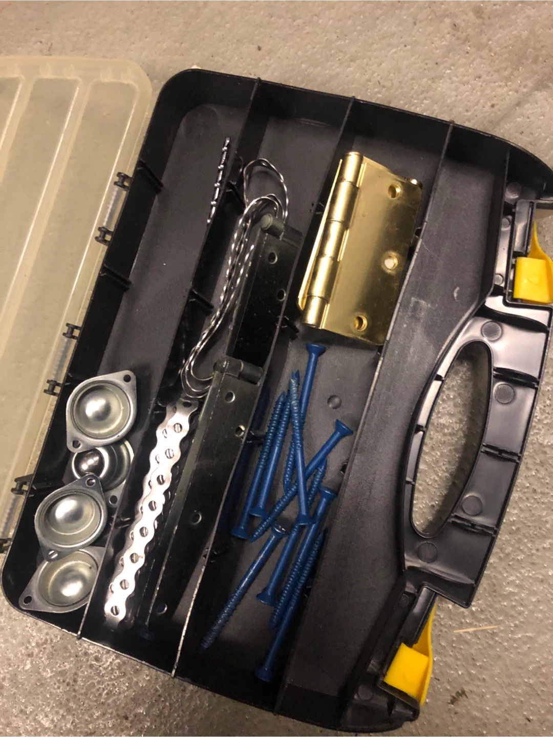 26Toolbox with hardware, including hinges, screws, and other small parts