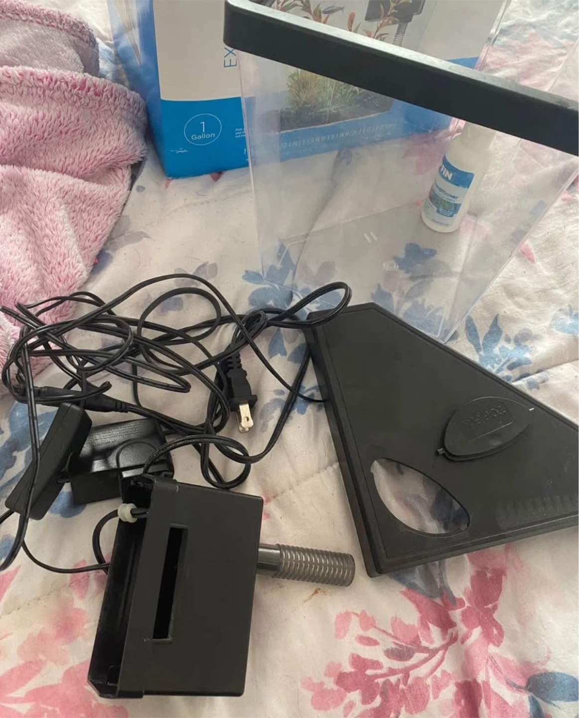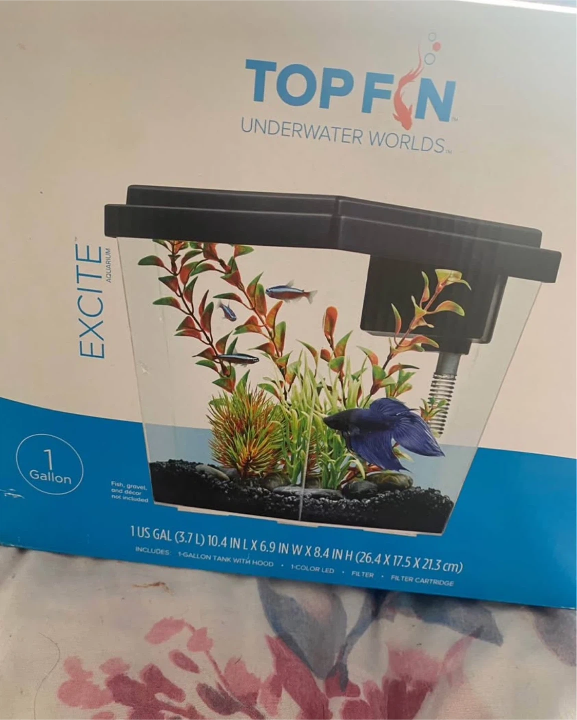 10Selling a Top Fin Excite 1-gallon fish tank! It comes with a hood, colour LED, and filter cartridge. The dimensions are 10.4 in L x 6.9 in W x 8.4 in H (26.4 x 17.5 x 21.3 cm).