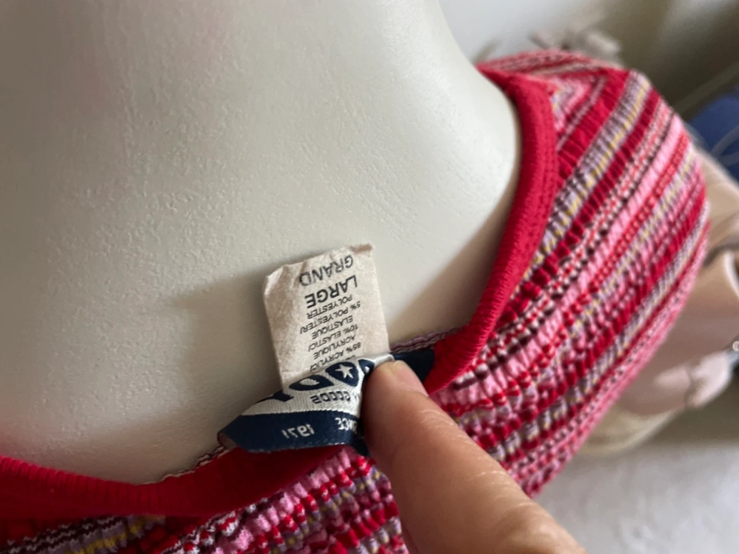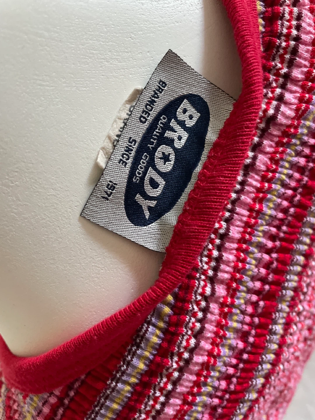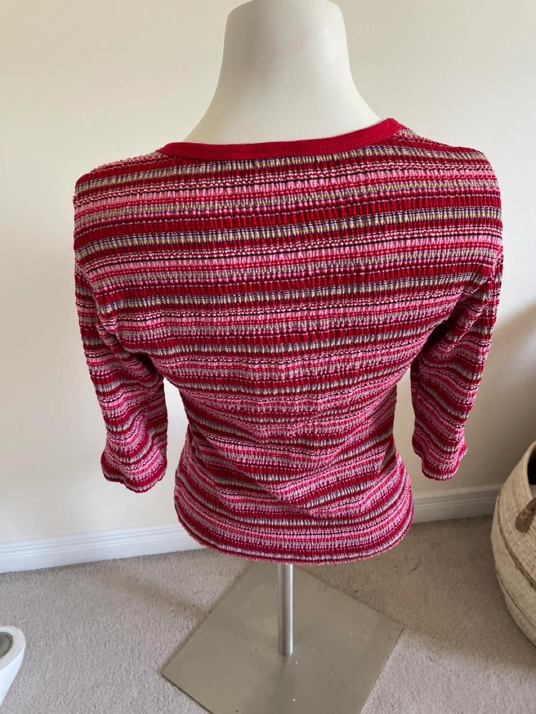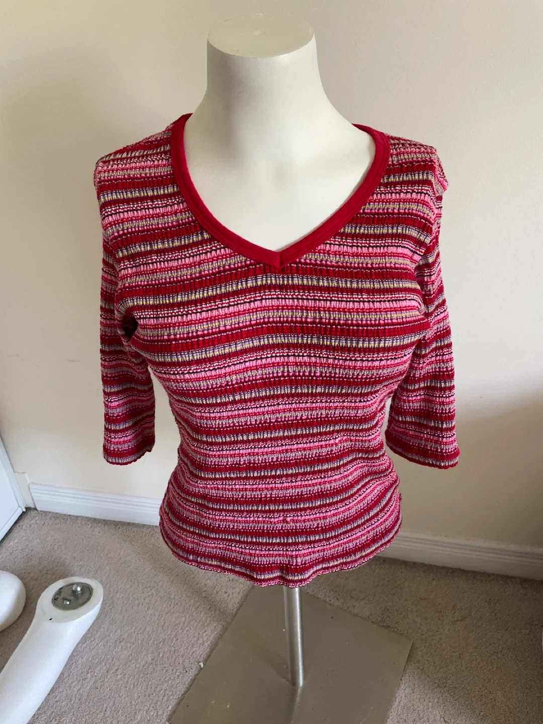 Selling a Brody top in size large. It's a red, pink, and tan striped pattern with a V-neck. The material is 65% acrylic, 25% polyester, and 10% elastic