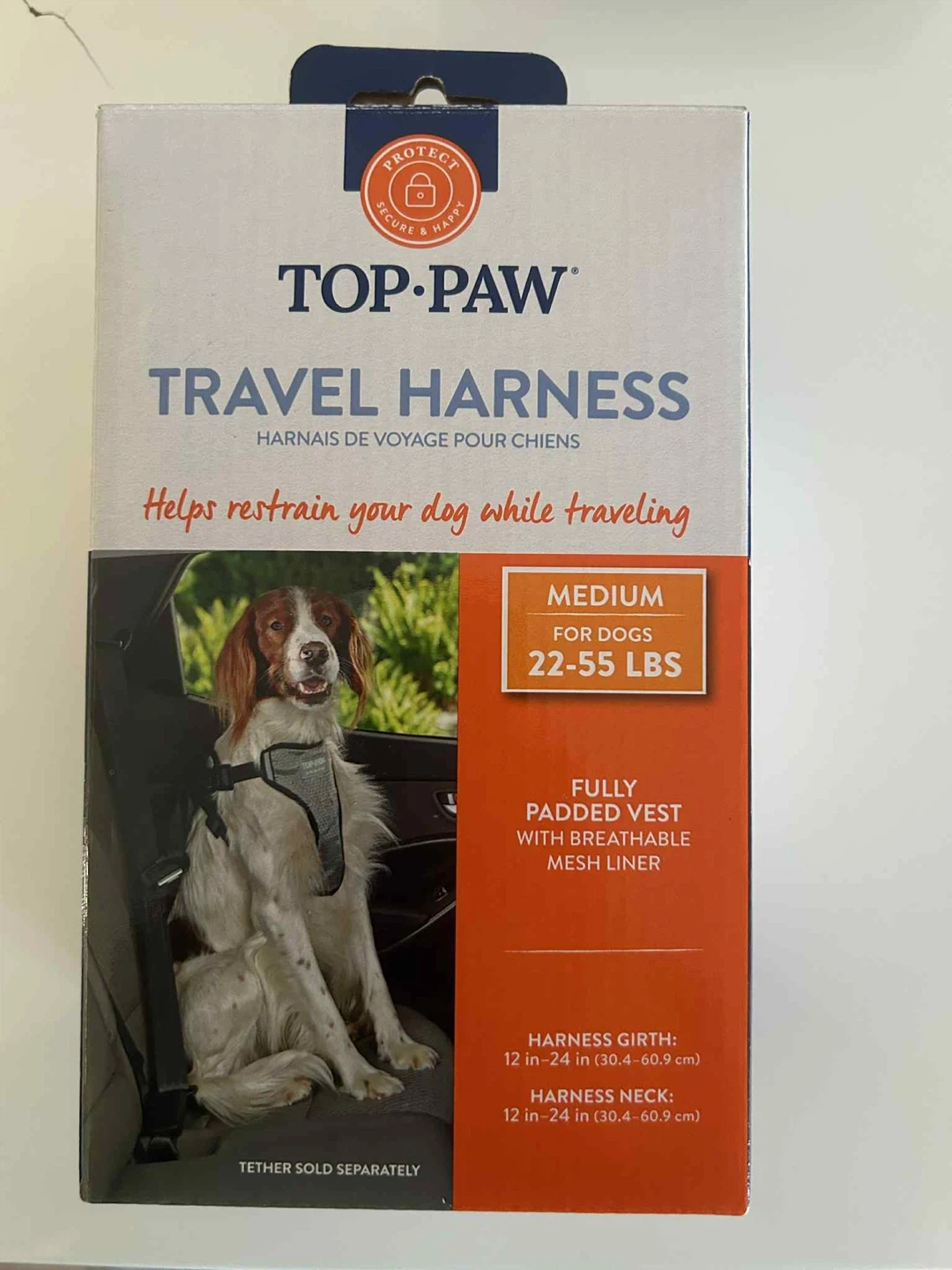 23Top Paw Travel Harness, size medium, for dogs 22-55 lbs! It helps restrain your dog while travelling. The harness has a fully padded vest with breathable mesh liner. Girth: 12-24 inches (30.4-60.9 cm) Neck: 12-24 inches (30.4-60.9 cm)