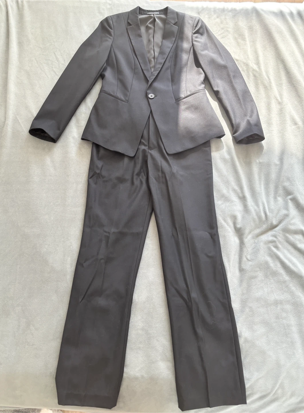 Selling a women’s black suit set including the blazer and matching trousers. It’s a Size L with a very clean, professional fit—perfect for interviews, work, or graduation.