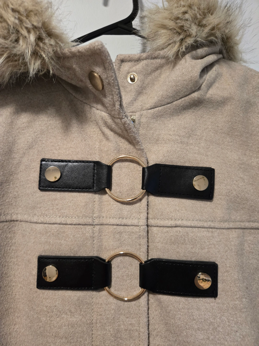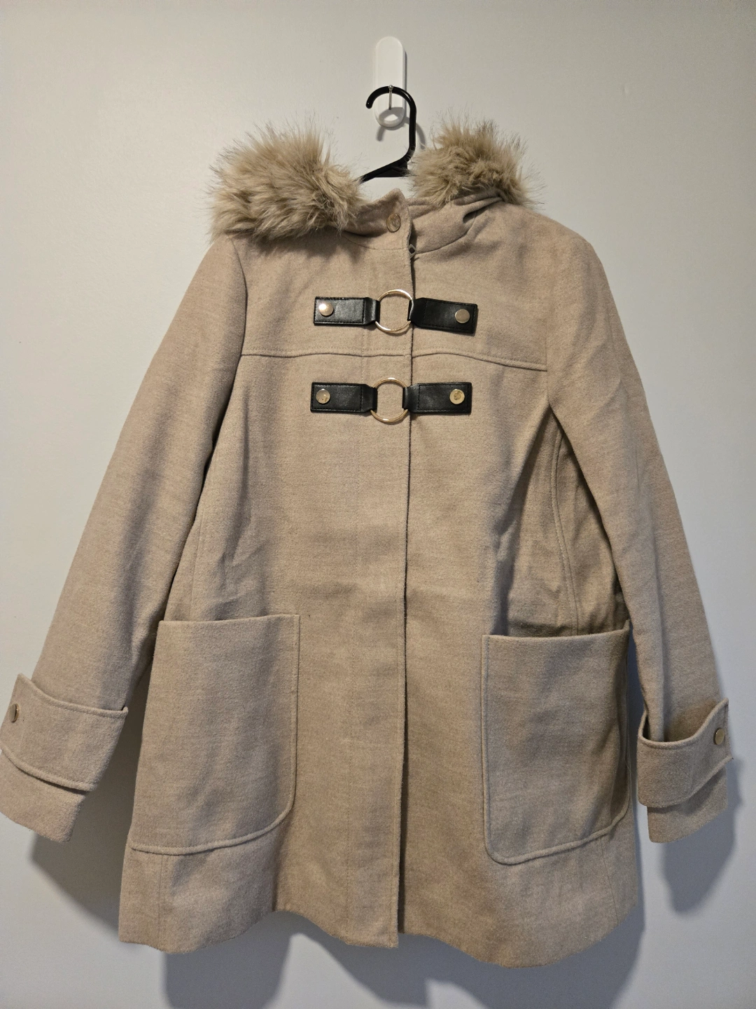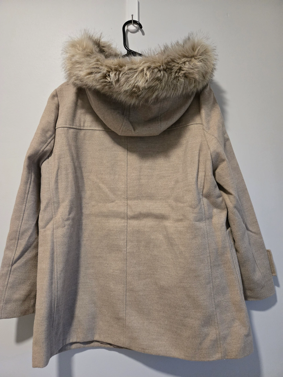 55Women's beige wool blend coat. Features a faux fur lined hood and gold toggles. Has pockets. Great for colder weather. pickup in Langley