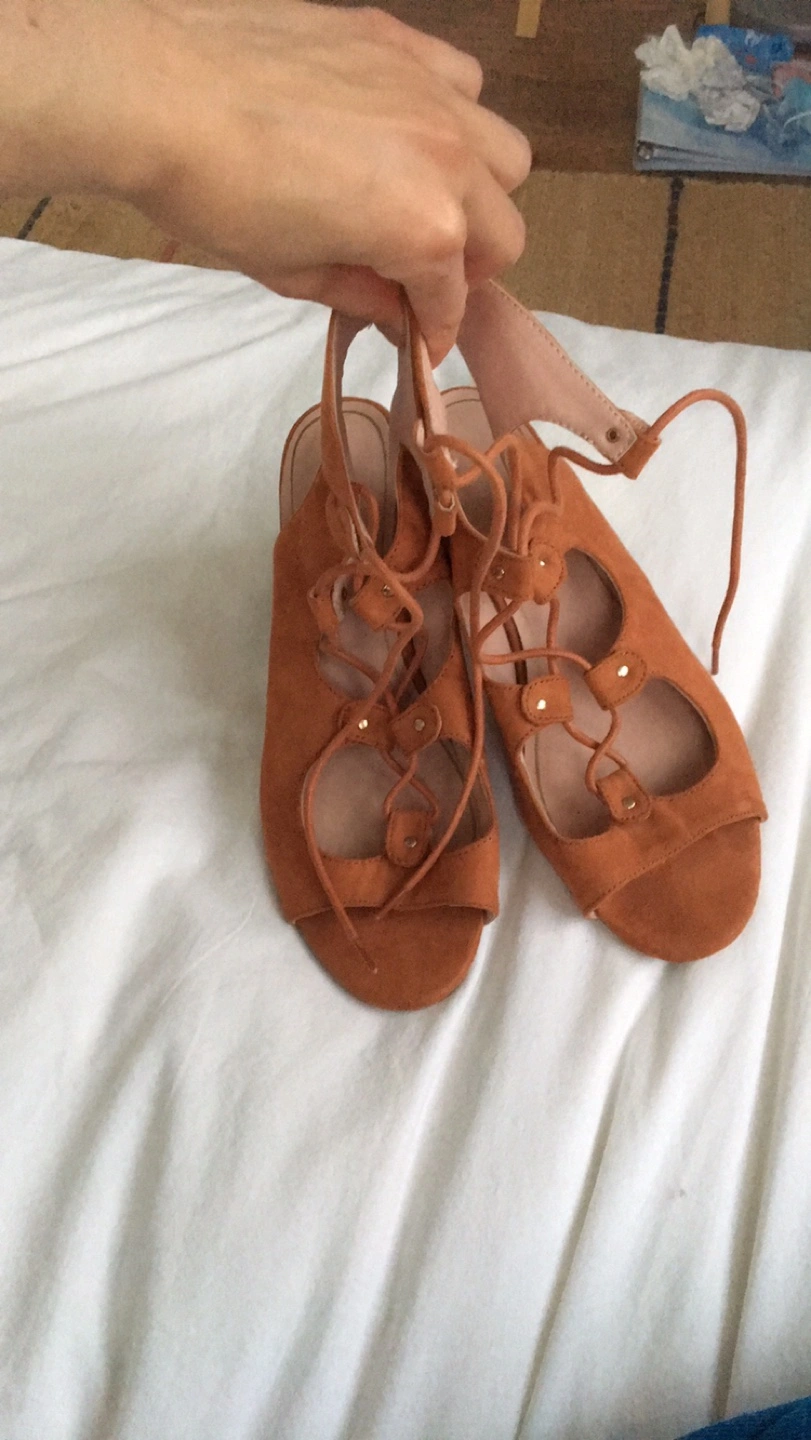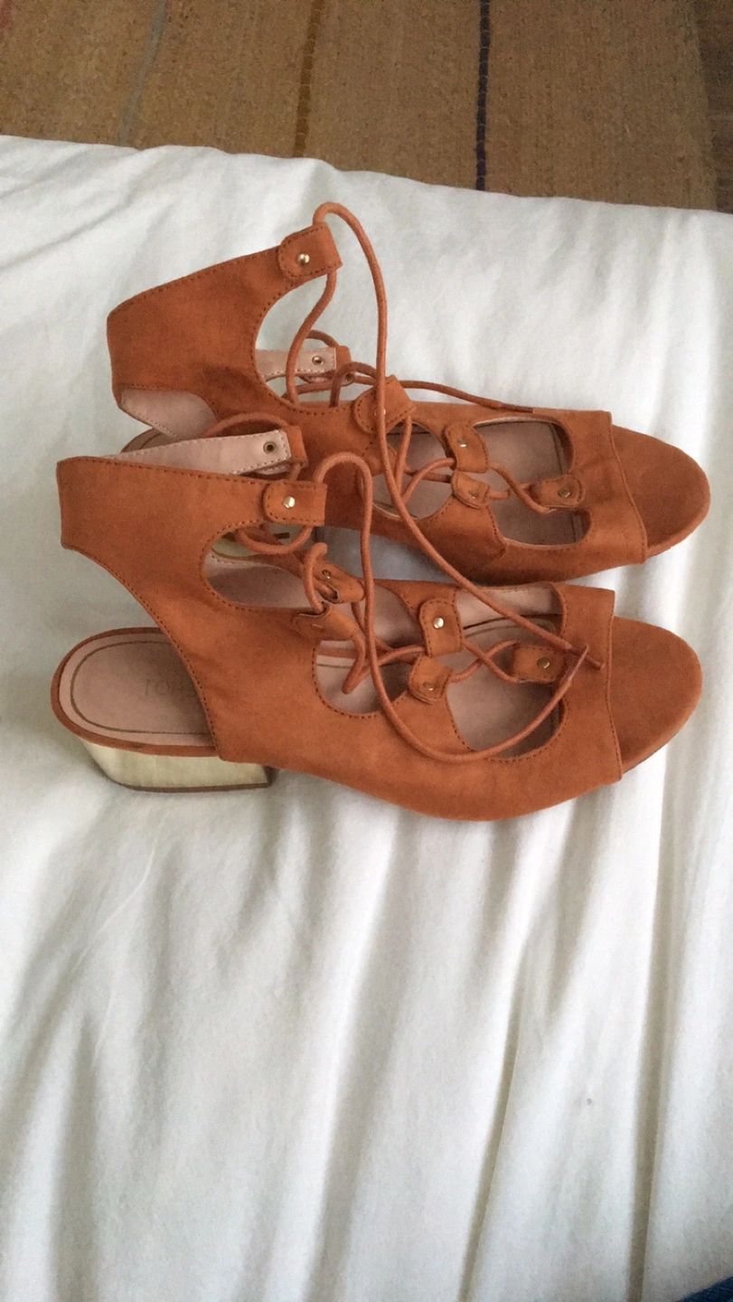 Cute Topshop heeled sandals in a warm, earthy tone! They feature a stylish lace-up design and a comfortable heel height. Perfect for adding a touch of flair to your summer outfits. Size 8.