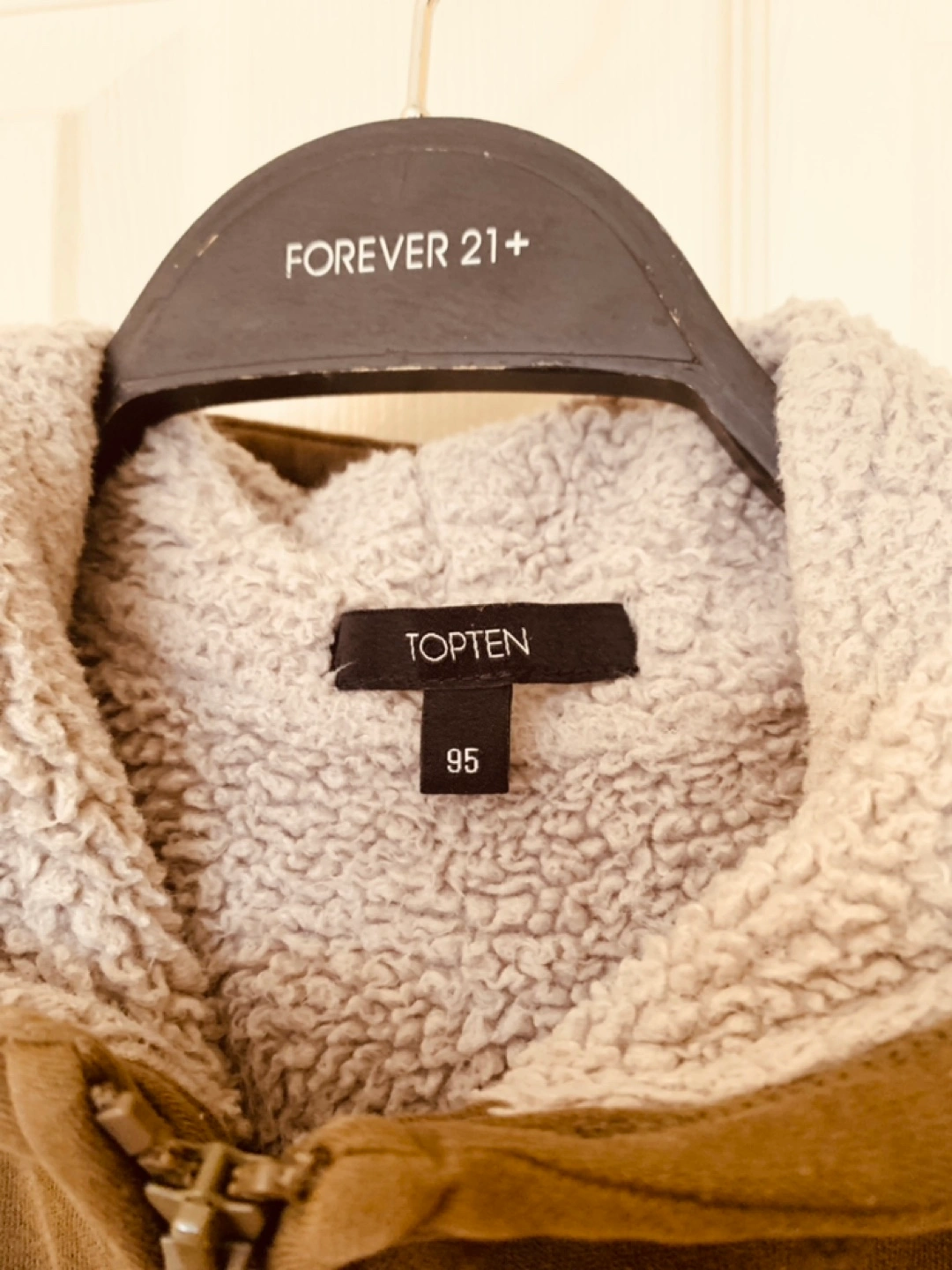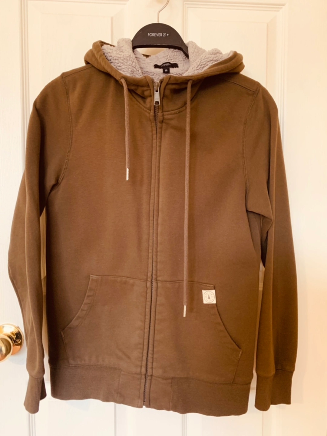 467Olive green zip-up hoodie. Fleece-lined hood. Long sleeves. Front pouch pocket. Drawstrings. Size 95. S~M size