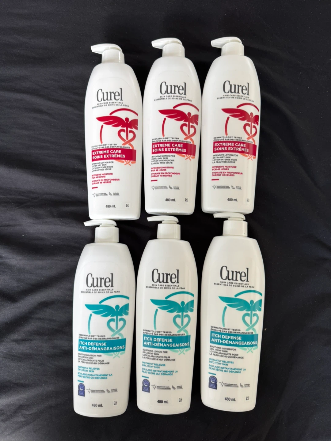 Three Curél Extreme Care Intensive Lotion bottles for extra dry skin, providing 48 hours of moisture. Also includes three Curél Itch Defense Soothing Lotion bottles that instantly relieve dry, itchy skin. Each bottle contains 480 mL.