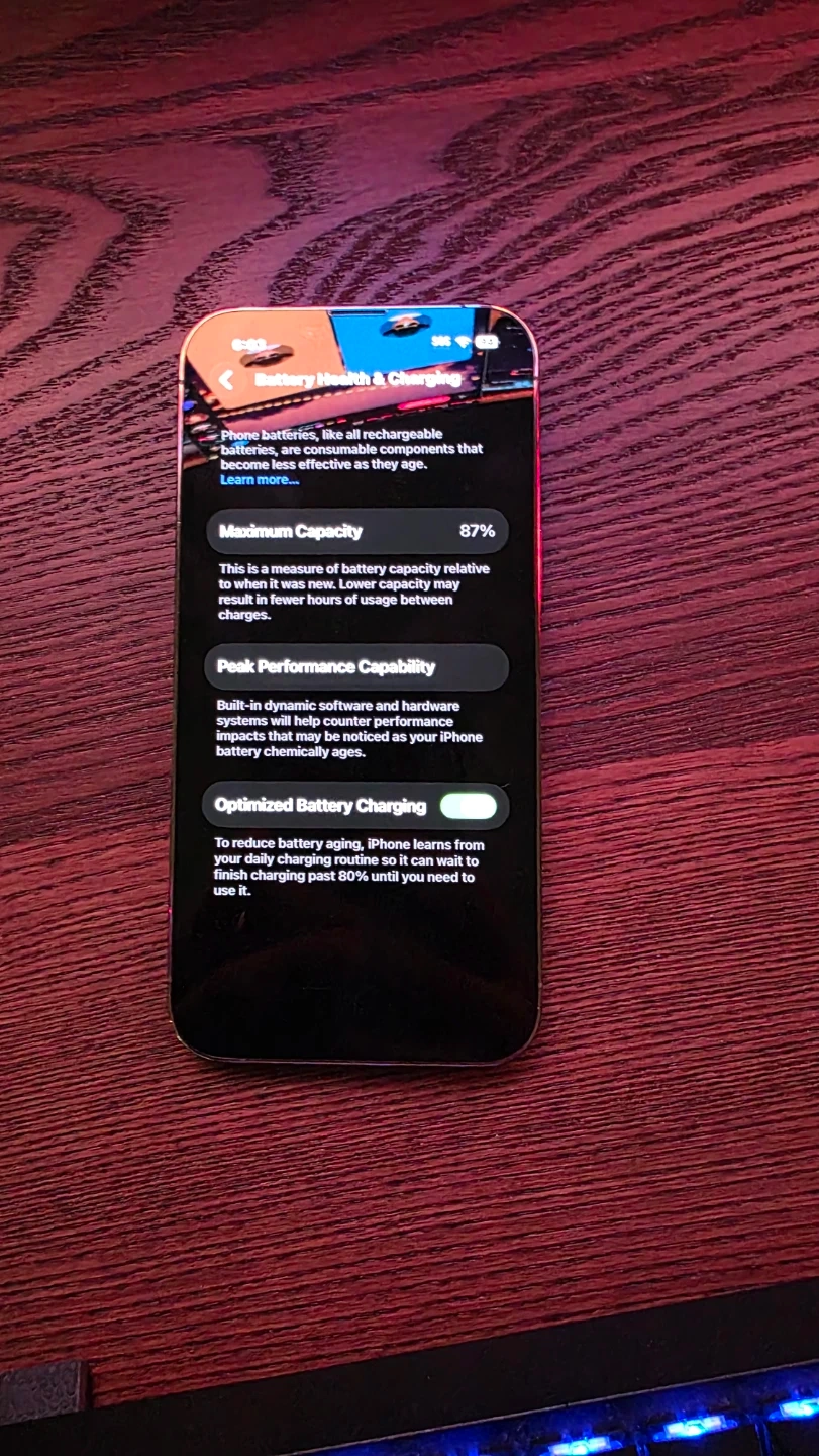 Apple iPhone 13 Pro in excellent condition. Maximum battery capacity is 87%. Features optimized battery charging to reduce aging.