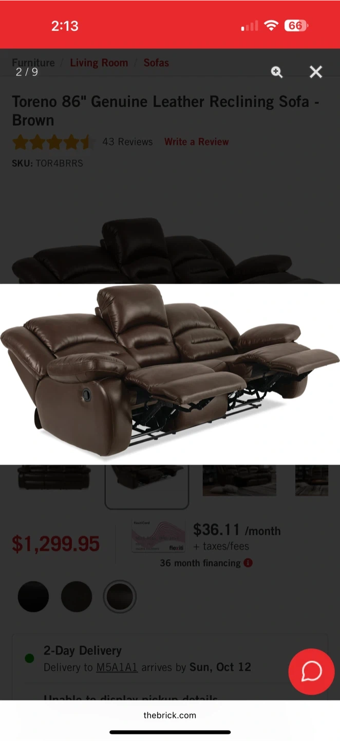 39Selling a Toreno 86" genuine leather reclining sofa in brown. This comfy sofa is perfect for your living room. The original price was $1,299.95. It's in good condition and ready for a new home! Open to all offers! Pickup only at Don Mills & Eglinton
