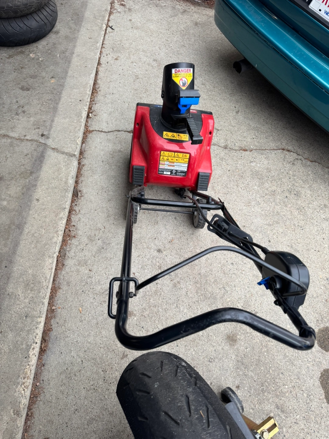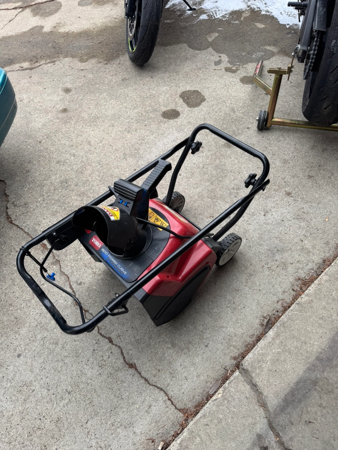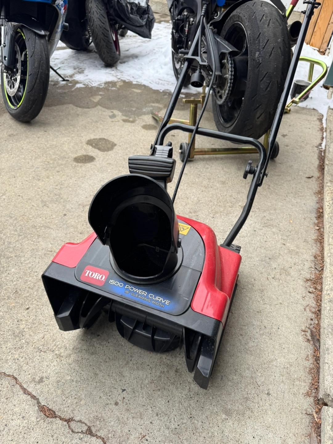 55Used Toro Power Curve snowblower. 18-inch clearing width. Electric start. Good condition. Includes foldable handle for easy storage. Electric with cord.