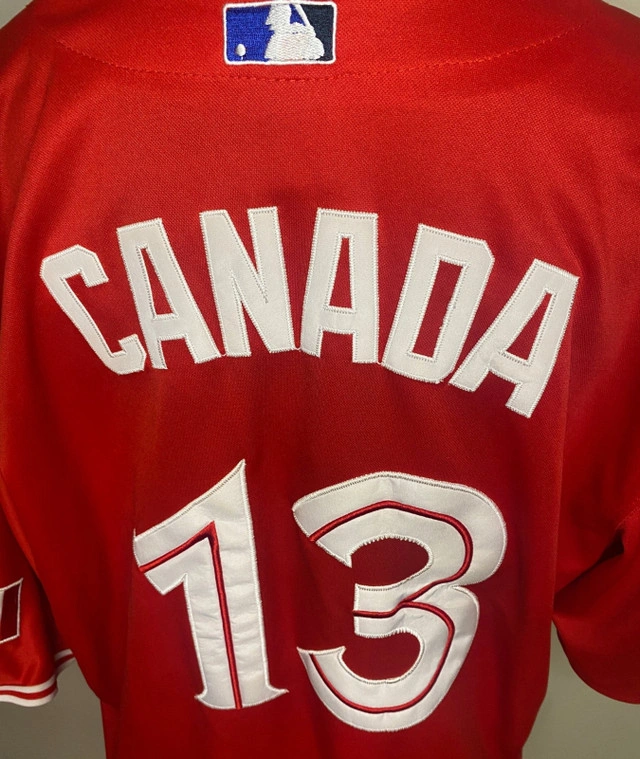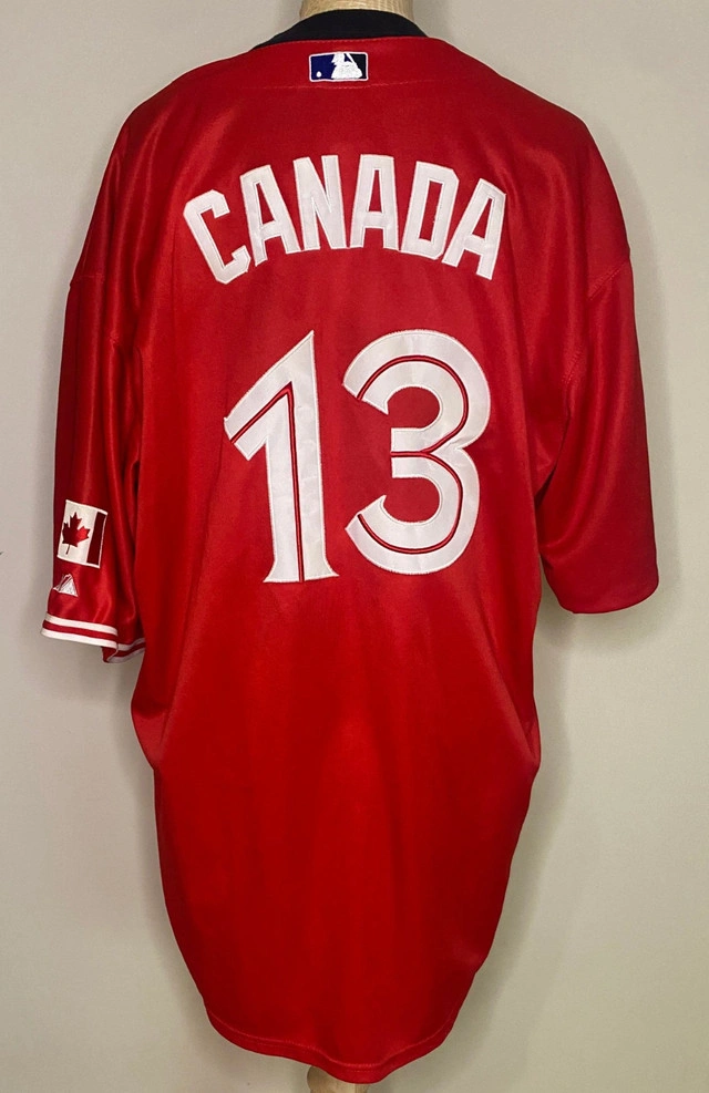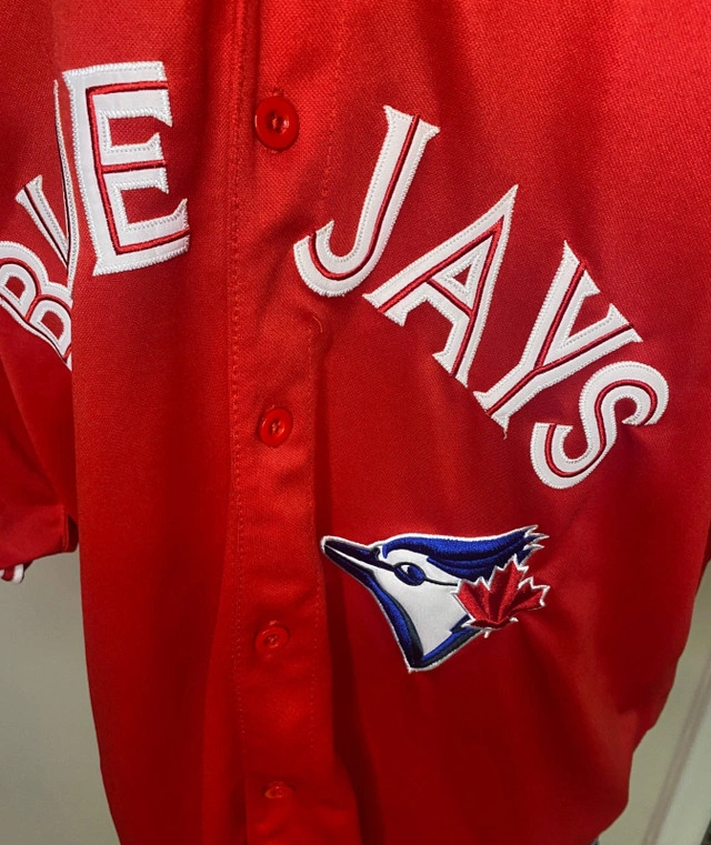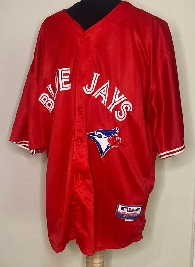 Celebrate your love for the Toronto Blue Jays and show your Canadian pride at the same time with this 2012-13 Toronto Blue Jays Canada Day Majestic Jersey. This officially licensed jersey features the Blue Jays' iconic logo and lettering with a bold red base color in honor of Canada Day. The wonderful "Canada" nameplate ensures that there is no mistaking your love for the great country of Canada and the Toronto Blue Jays. Made with polyester, for breathability and durability, it’s the perfect collectible for fans to wear or a standout piece to display in your home. Show your national pride and Blue Jays spirit in this awesome jersey. This Toronto Blue Jays 2012-13 Canada Day Majestic Jersey is in excellent pre-loved condition with no rips, stains or smell. It is a size 54, which roughly translates to an adult XXL. Show your love and support of the Toronto Blue Jays and Canada today. Local pickup is in Etobicoke near Islington and The Westway.
