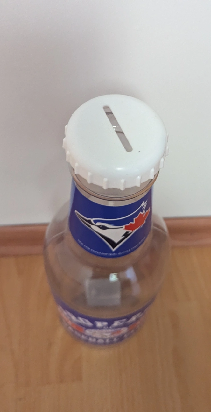 Here's a Toronto Blue Jays bottle coin bank! It's a fun way to save your change and show your team spirit at the same time