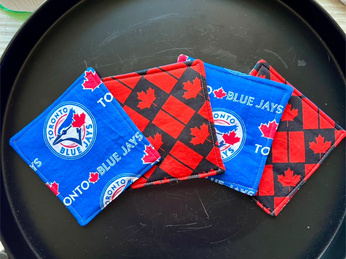 106Set of handmade Toronto Blue Jays coasters! They have the Blue Jays logo on one side and a red maple leaf pattern on the other. Perfect for any Jays fan!