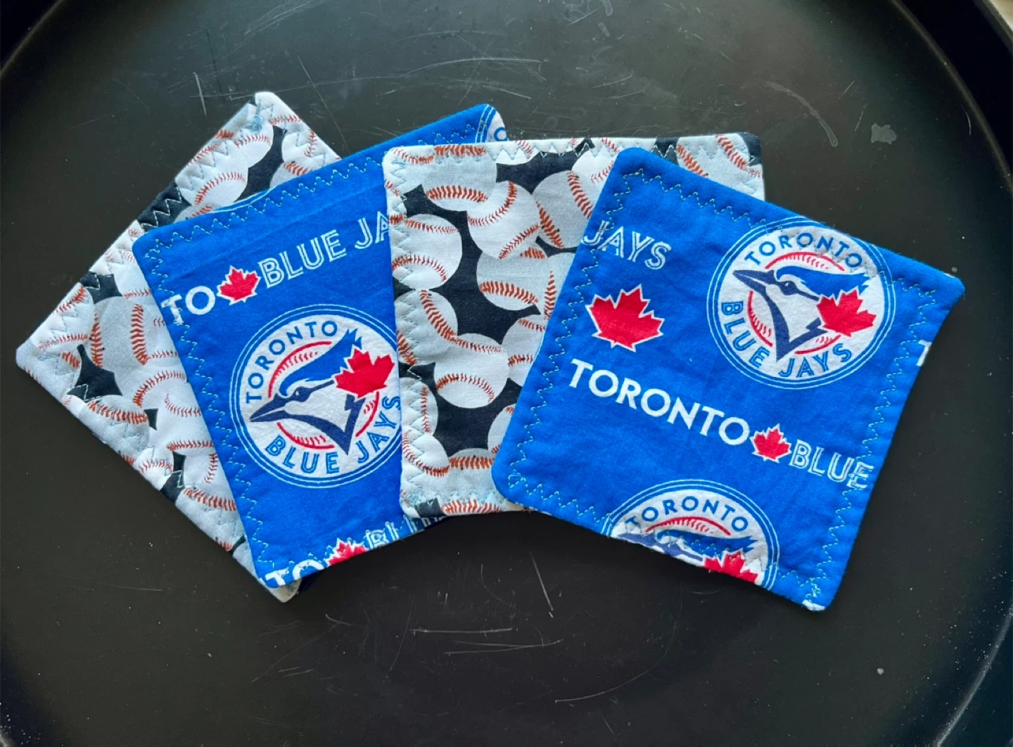 106Show your team spirit with these handmade Toronto Blue Jays coasters! There are four in the set, perfect for game days or everyday use. One side features the Blue Jays logo and the other has a baseball print. They're in great condition and ready to protect your furniture!