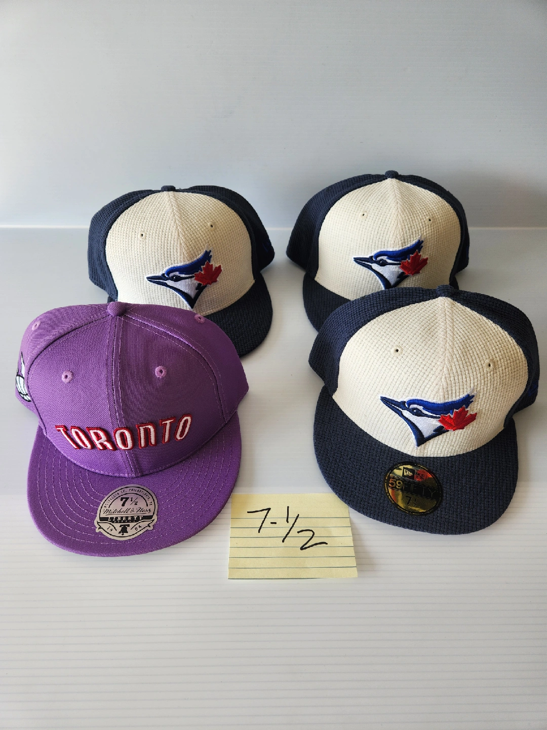 Selling a few Toronto Blue Jays hats. There are three of the same style, and one purple Mitchell & Ness hat. All are size 7 1/2 Brand New $25 each Plaza pick up See Map